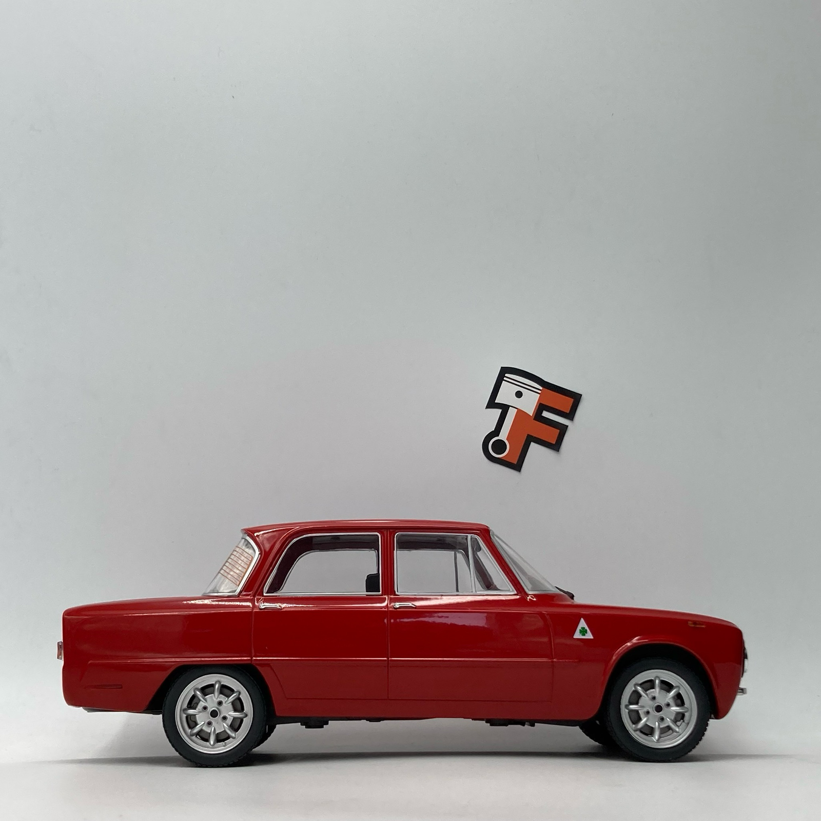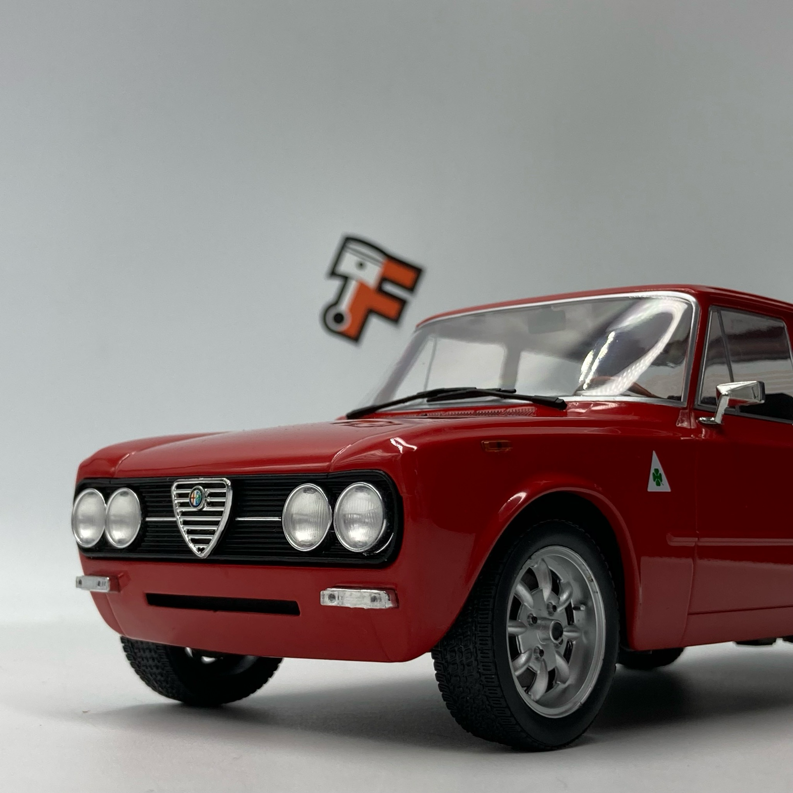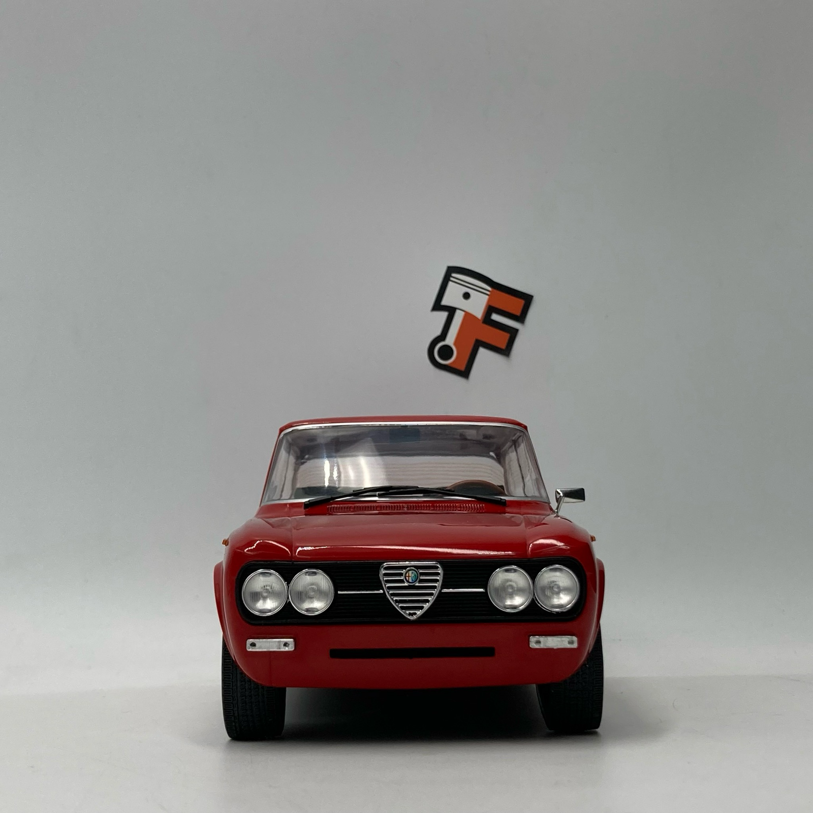 L’évolution finale de l’icône : l’Alfa Romeo Giulia Nuova Super 1974 L’Alfa Romeo Giulia Nuova Super de 1974 représente l’ultime évolution stylistique de la célèbre berline de Milan. Reconnaissable entre toutes grâce à sa face avant modernisée, intégrant quatre projecteurs de même diamètre et une calandre en plastique noir plus contemporaine, elle conserve l’âme sportive qui a fait le succès de la gamme Giulia depuis 1962. Cette reproduction au 1/18 par Model Car Group (MCG) sous la référence MCG18333 est présentée dans le mythique Rosso Alfa, la couleur qui définit l’ADN de la marque. Ce modèle réduit capture avec une grande fidélité les lignes « carrées » et aérodynamiques si particulières de la Giulia. L’époque « Nuova Super » marquait une volonté d’Alfa Romeo d’apporter plus de confort et une esthétique rafraîchie à sa berline phare, tout en conservant le moteur double arbre à cames en tête qui offrait des montées en régime rageuses. Les finitions intérieures, le tableau de bord typique des années 70 et les jantes caractéristiques sont ici reproduits avec un soin méticuleux, faisant honneur à l’ingénierie italienne.