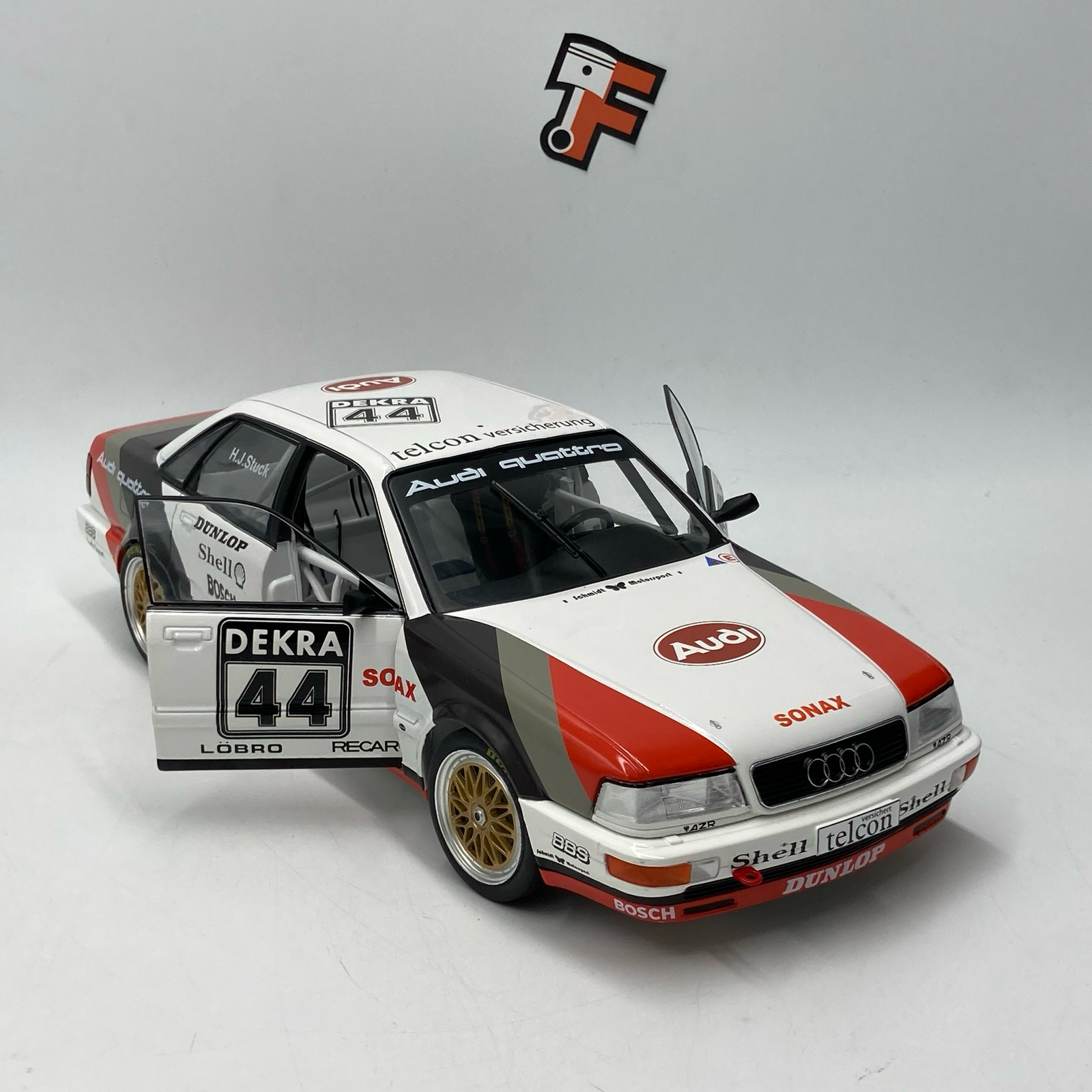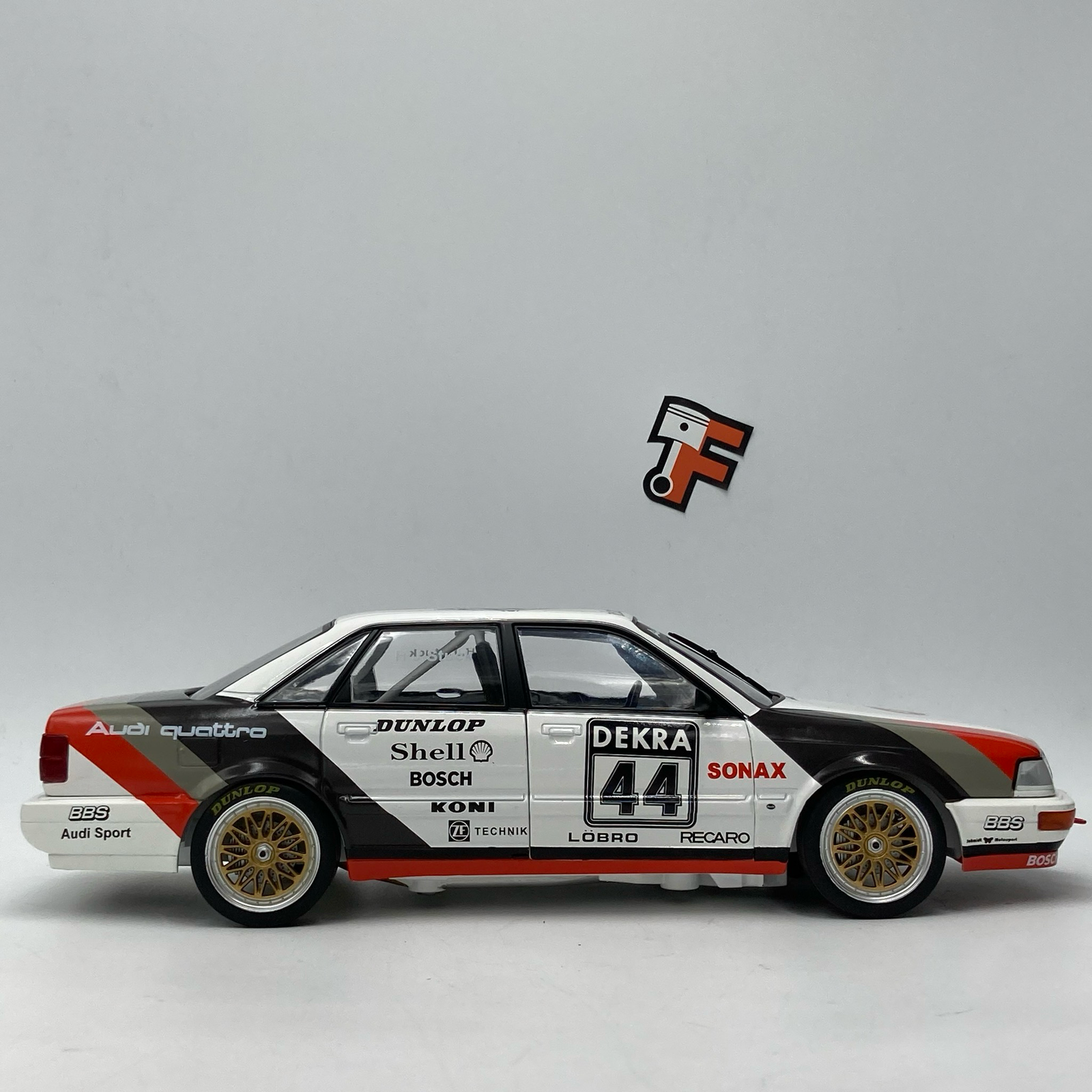 La livrée #44 incarne cette période mythique où Audi s’impose avec audace dans une discipline ultra-compétitive. Large, agressive, dotée d’ailes élargies et d’un aileron imposant, la V8 DTM est devenue une véritable icône des années 90.