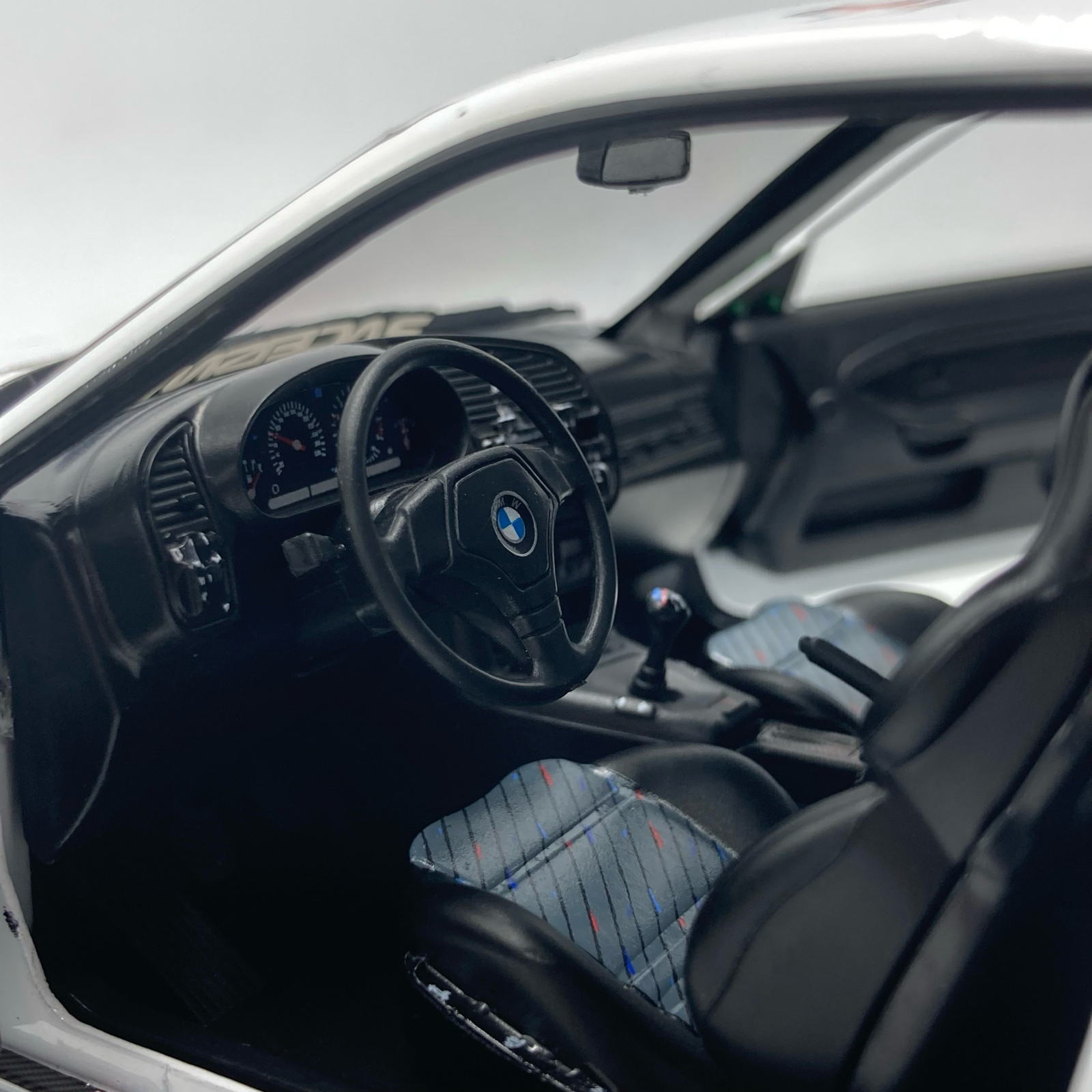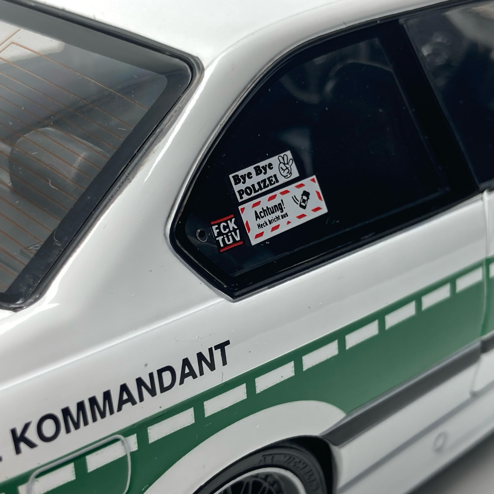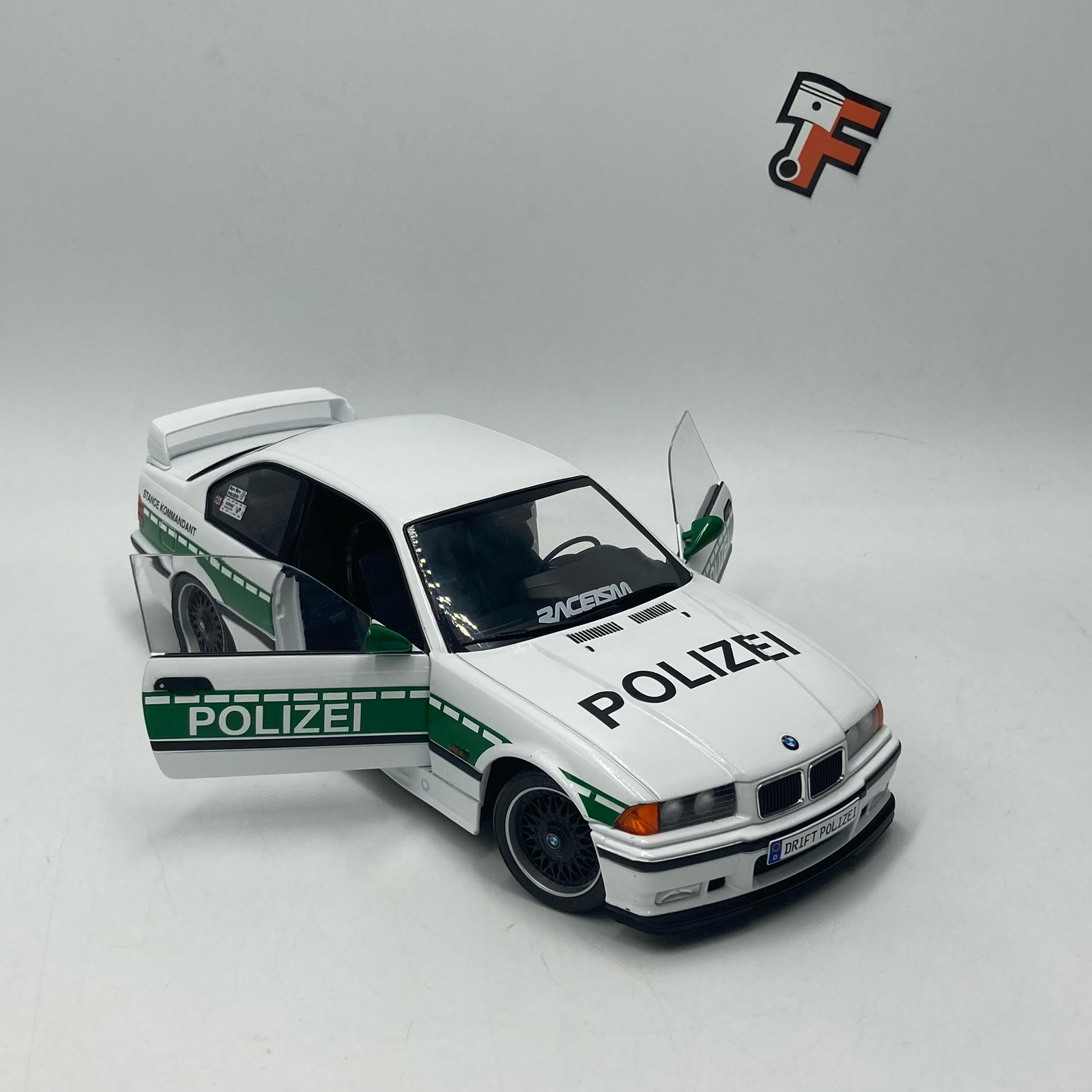 La miniature référence S1803915 reproduit fidèlement cette préparation atypique : livrée type police allemande revisitée, jantes sportives, caisse abaissée et détails spécifiques à l’univers du drift. Le kit carrosserie élargi, les éléments aérodynamiques et l’attitude agressive donnent à cette M3 une présence impressionnante en vitrine.