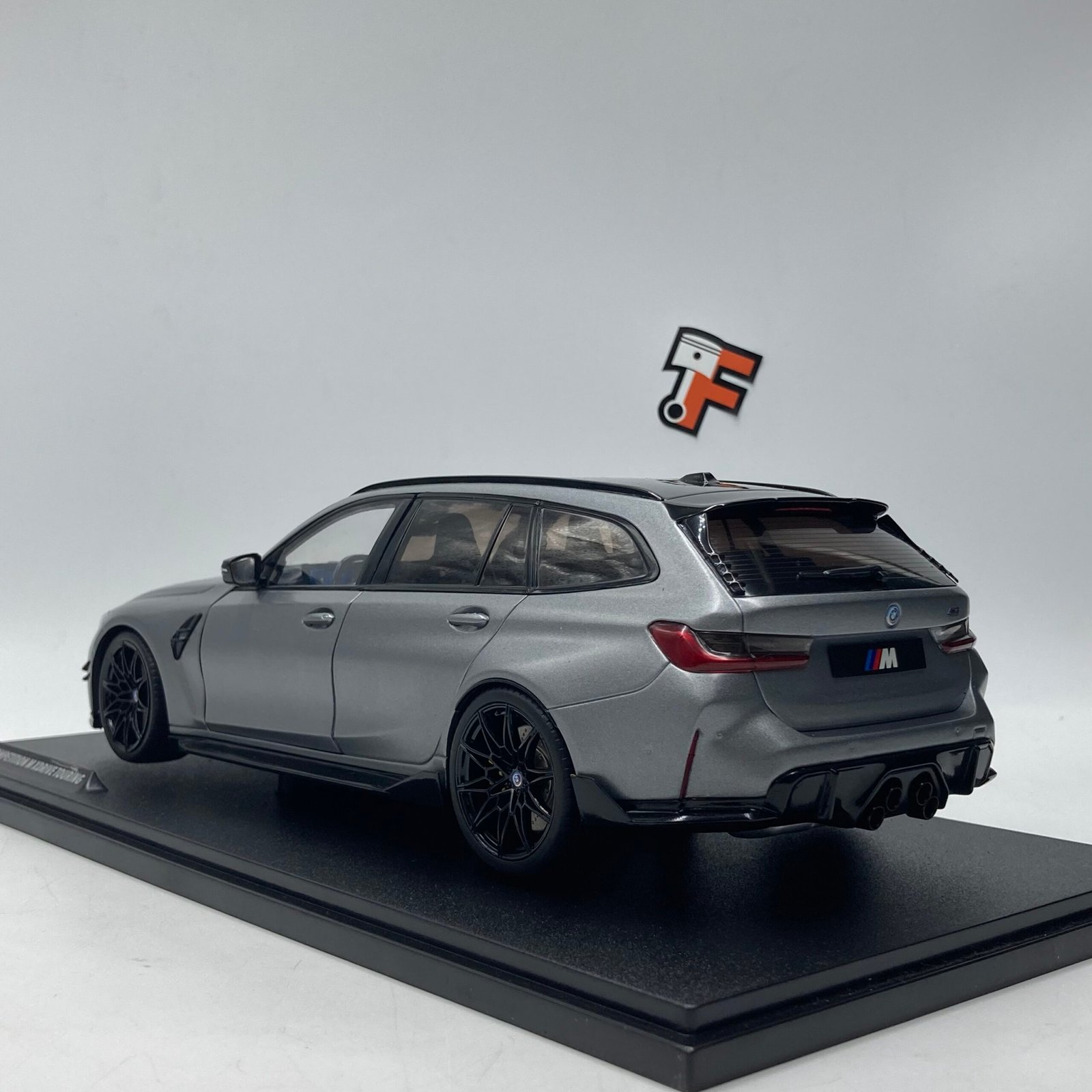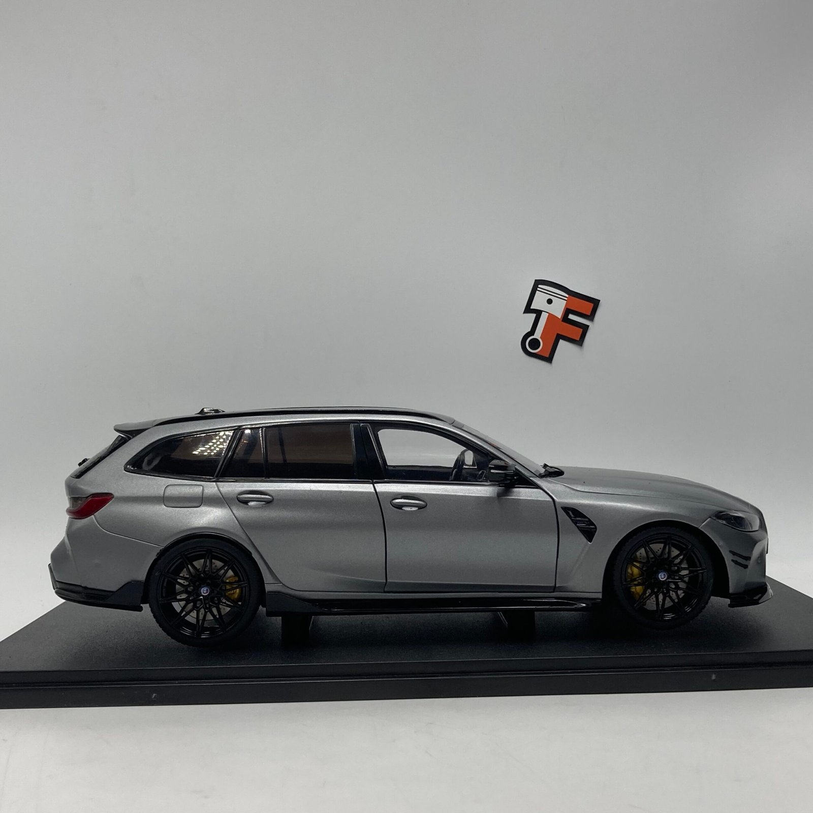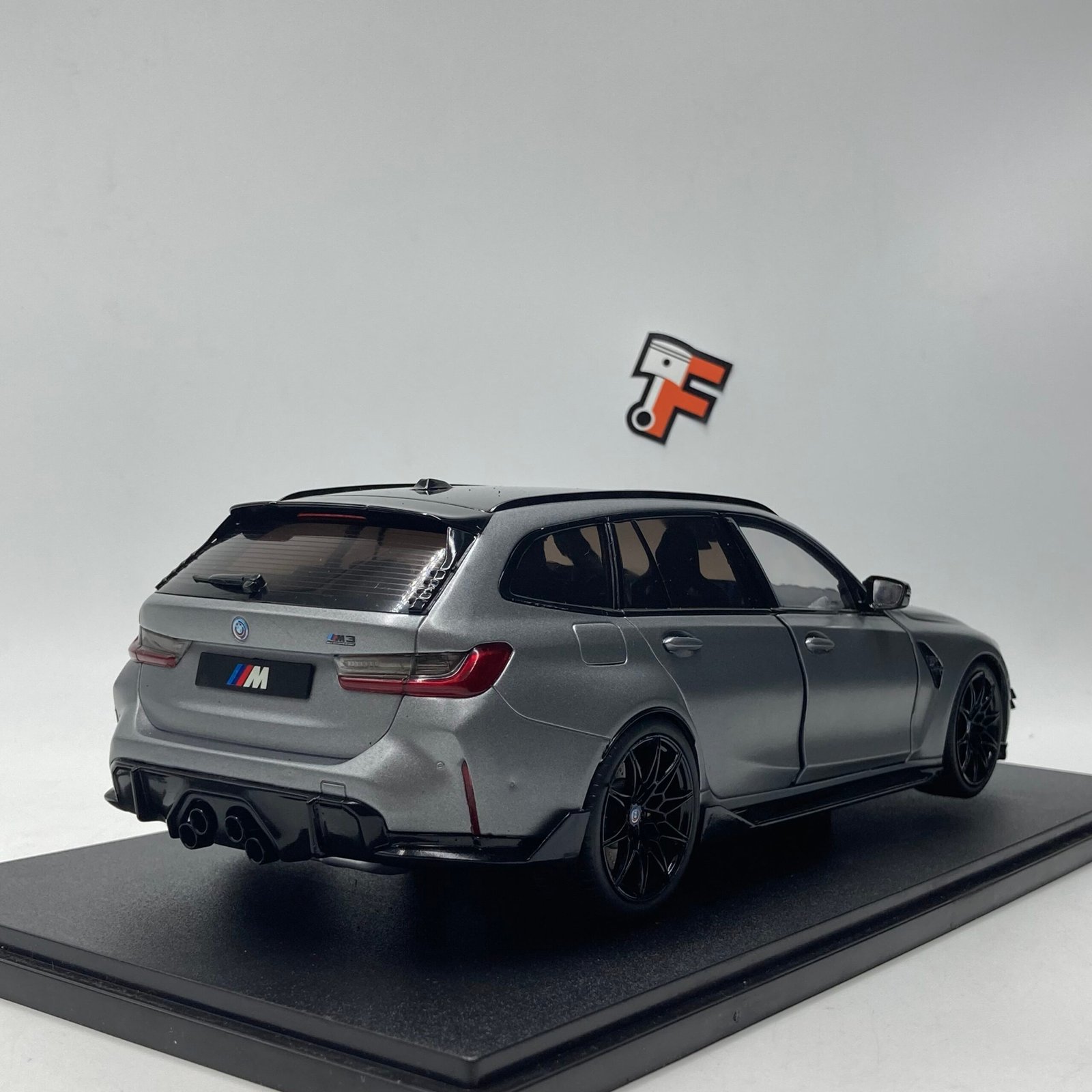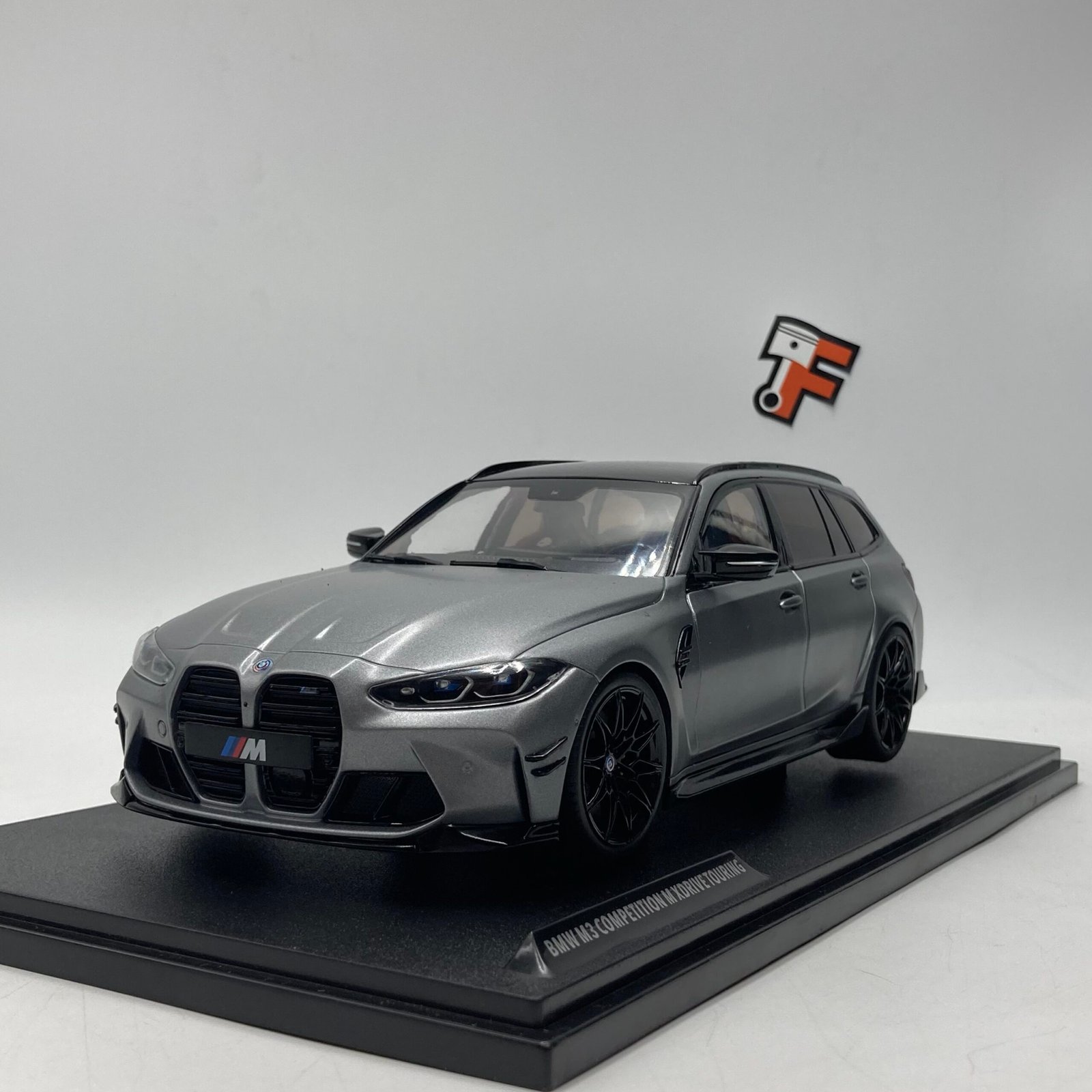 Cette miniature BMW M3 Touring (G81) 2023 reproduit une configuration particulièrement recherchée : la superbe teinte Frozen Pure Grey Metallic, une finition mate qui sublime les lignes agressives de la voiture.