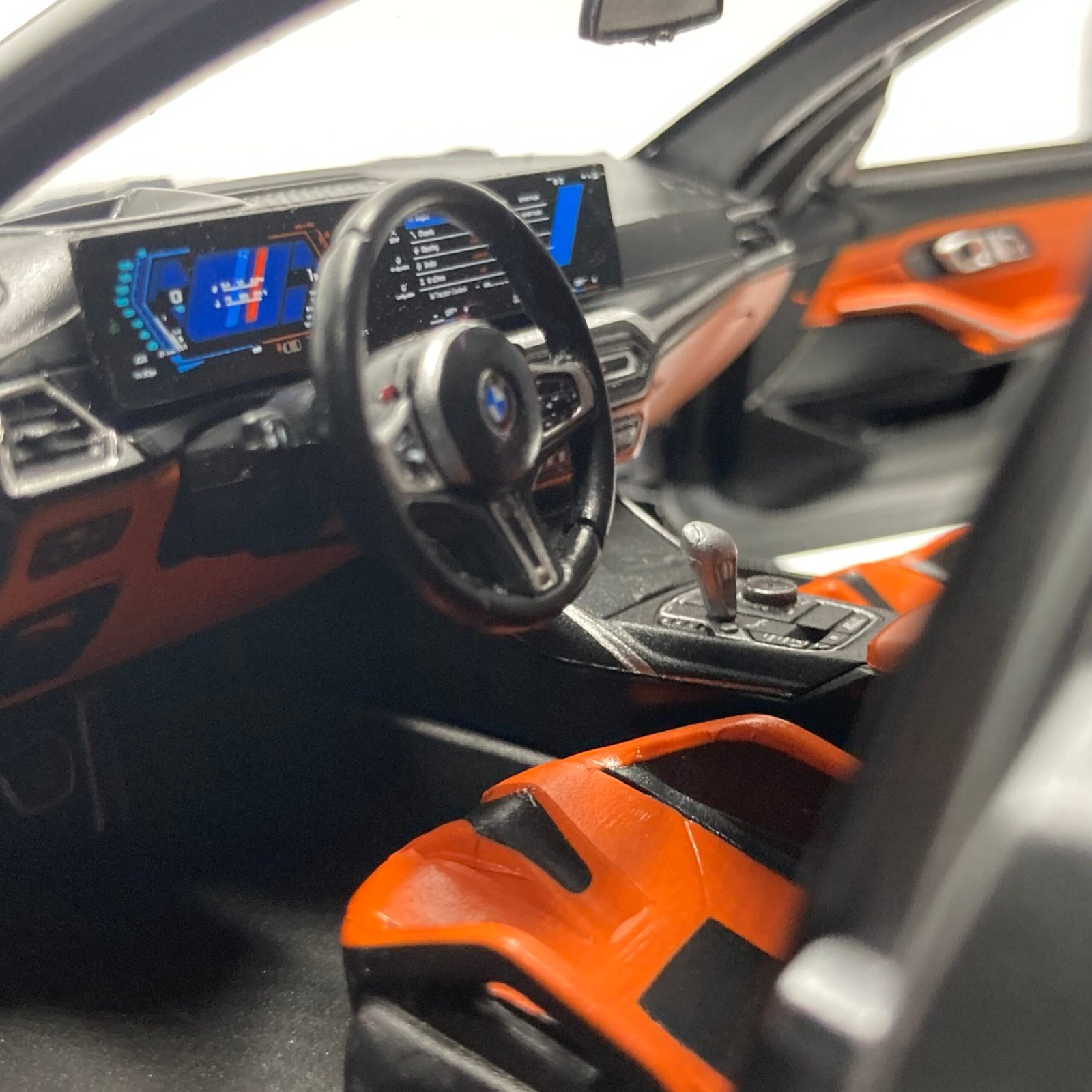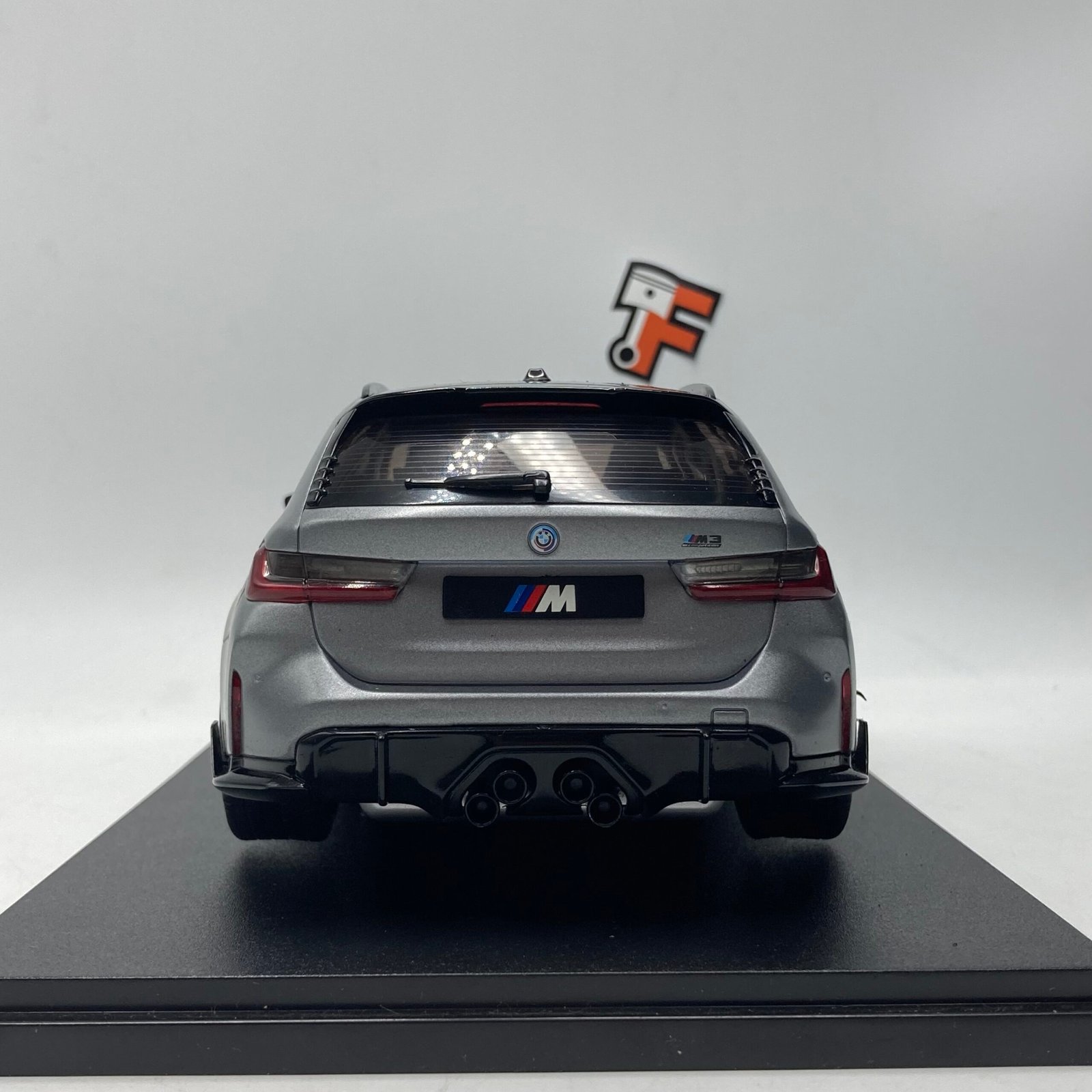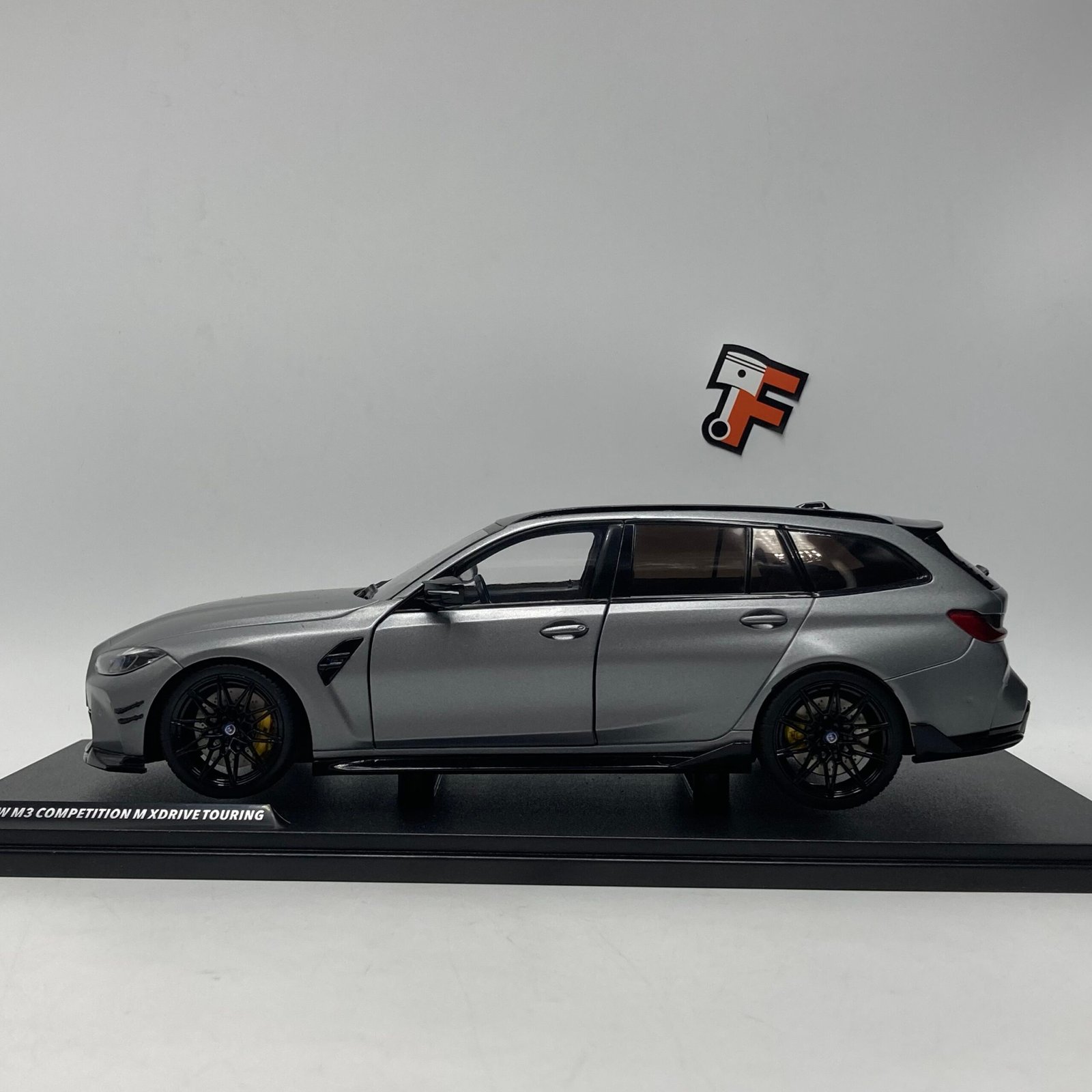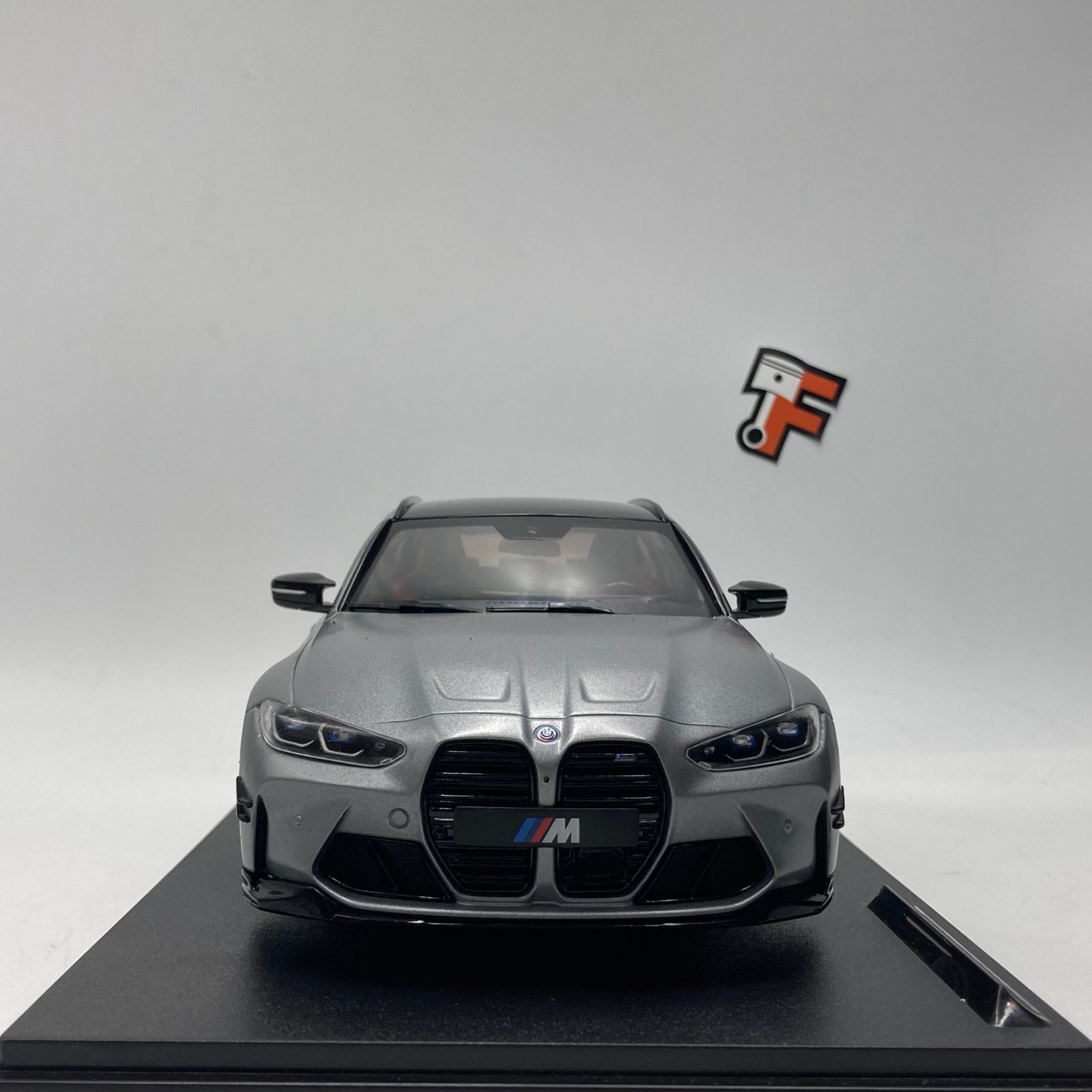 Cette miniature BMW M3 Touring (G81) 2023 reproduit une configuration particulièrement recherchée : la superbe teinte Frozen Pure Grey Metallic, une finition mate qui sublime les lignes agressives de la voiture.