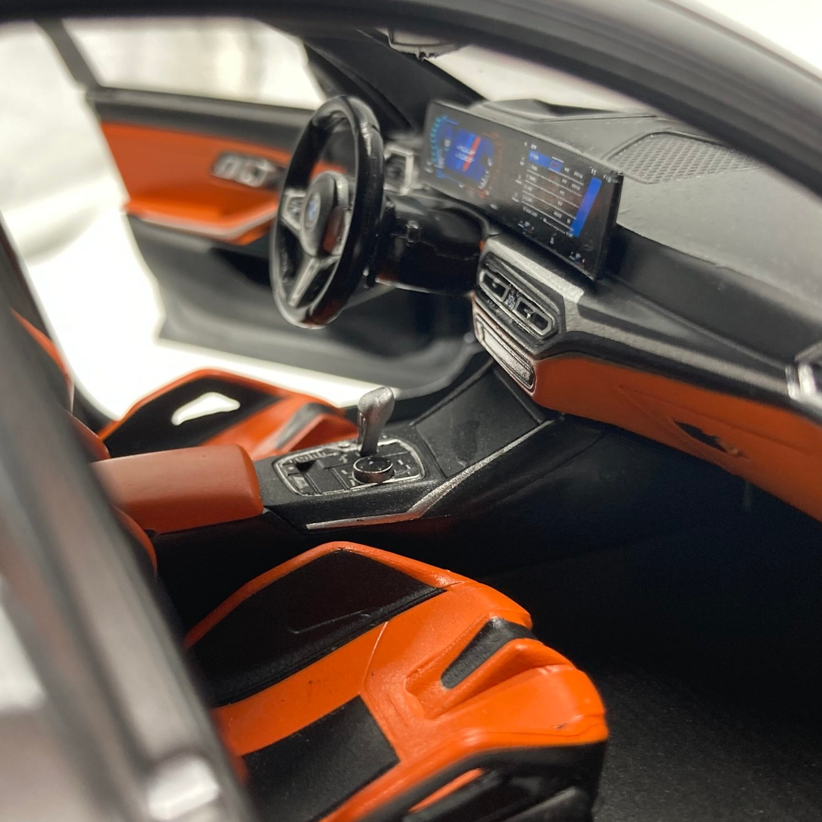 Elle est également équipée des BMW M Performance Parts, qui accentuent encore son caractère sportif : éléments aérodynamiques, détails carbone et touches racing. Chaque détail de cette miniature a été soigneusement reproduit pour offrir une fidélité exceptionnelle, faisant de ce modèle une pièce de choix pour les collectionneurs de miniatures BMW et d’automobiles sportives modernes.