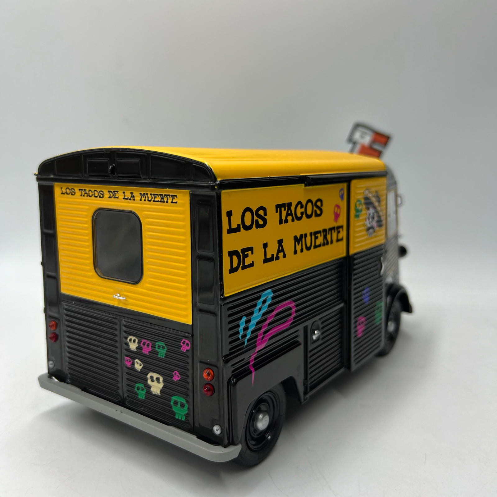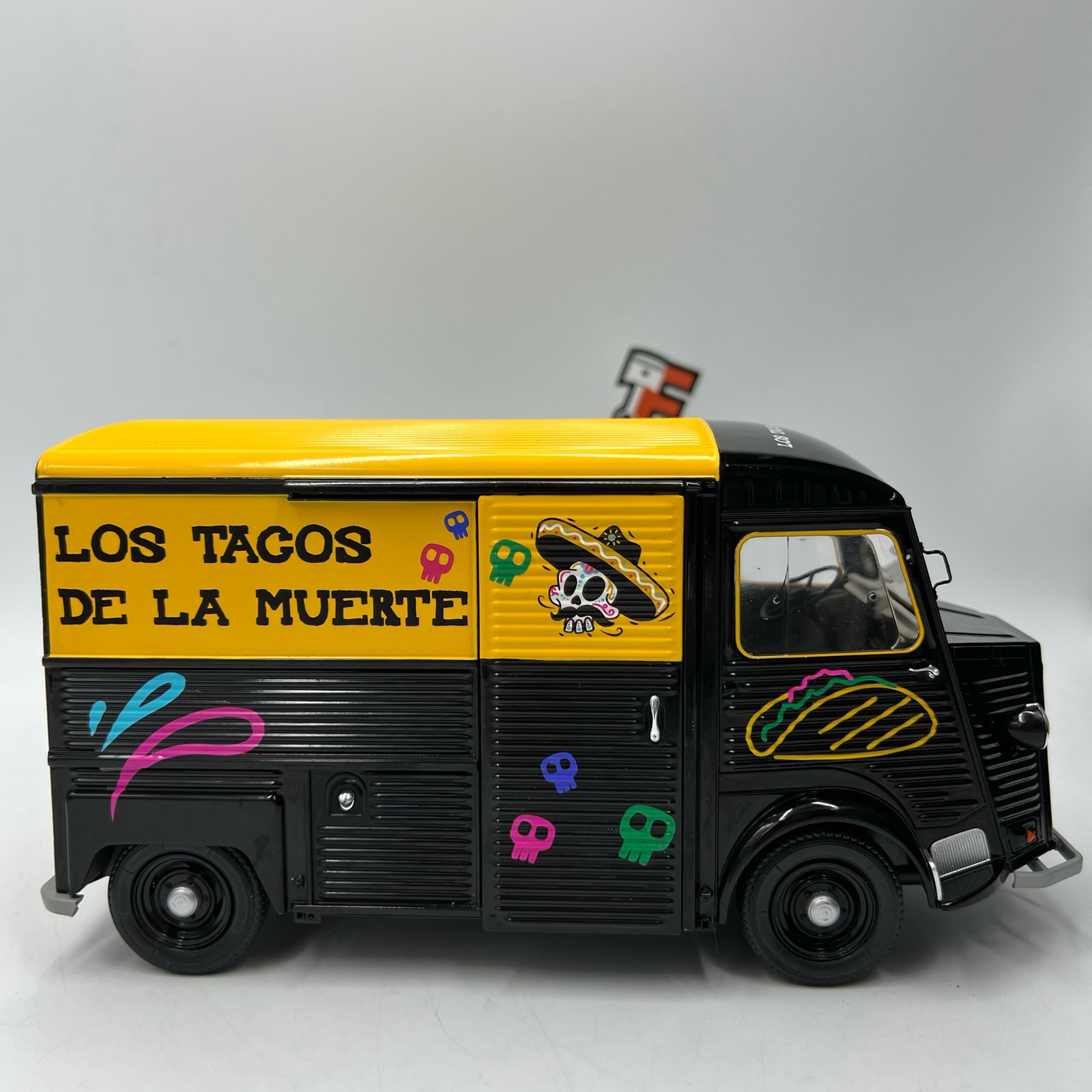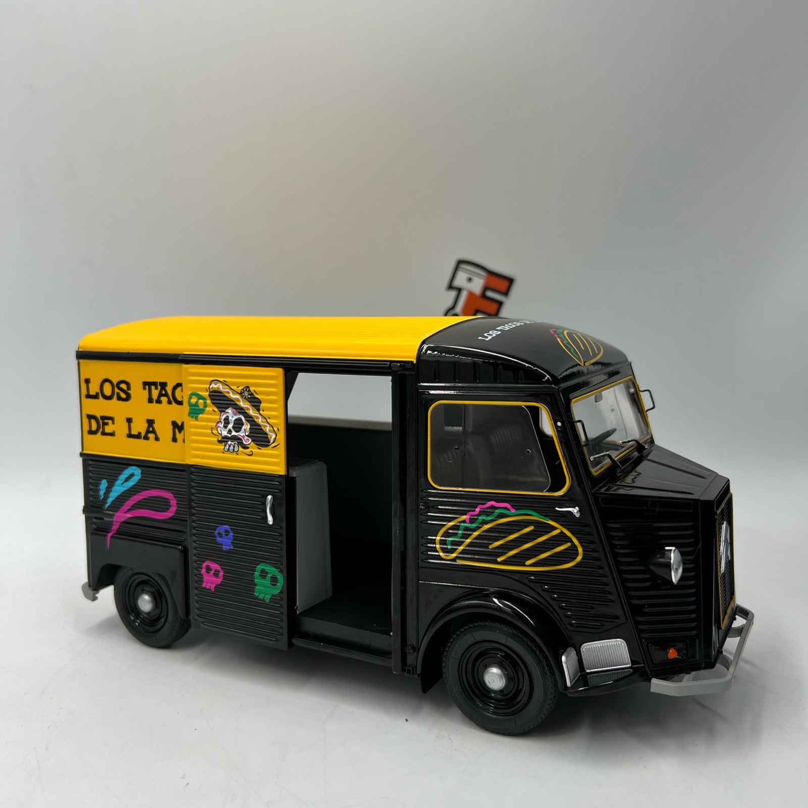Cette version Los Tacos 1969 apporte une touche colorée et festive, rappelant les food trucks de street food populaires. La miniature reproduit fidèlement les détails du véhicule : décoration spécifique, comptoir de service, accessoires et intérieur réaliste.