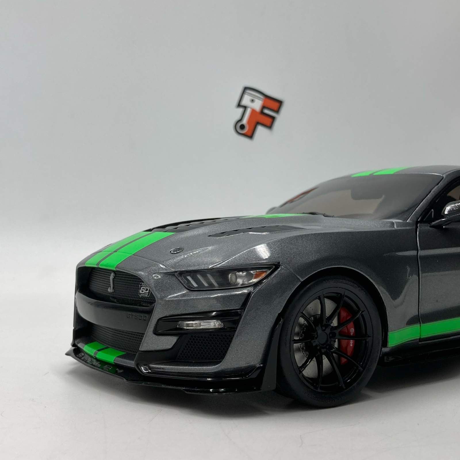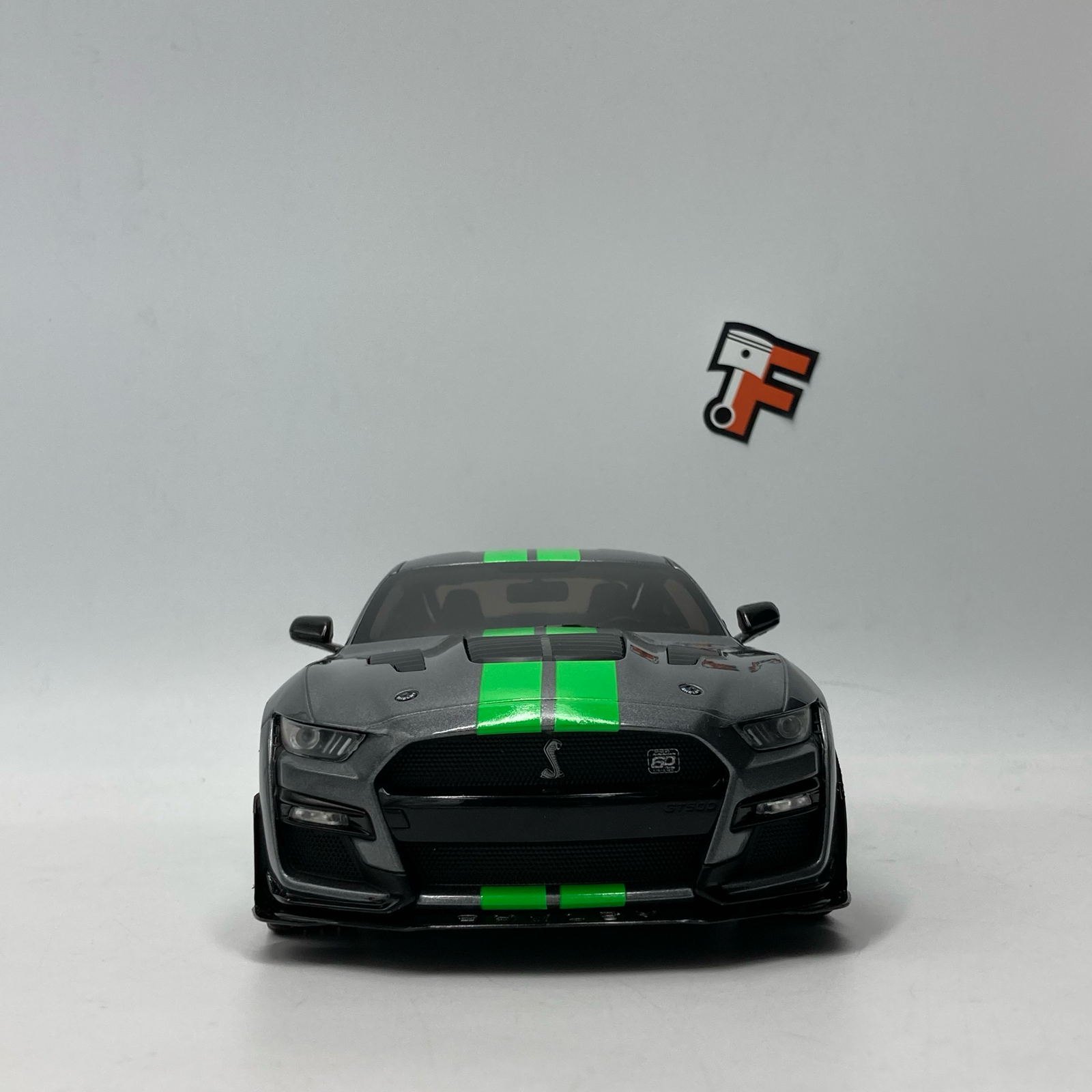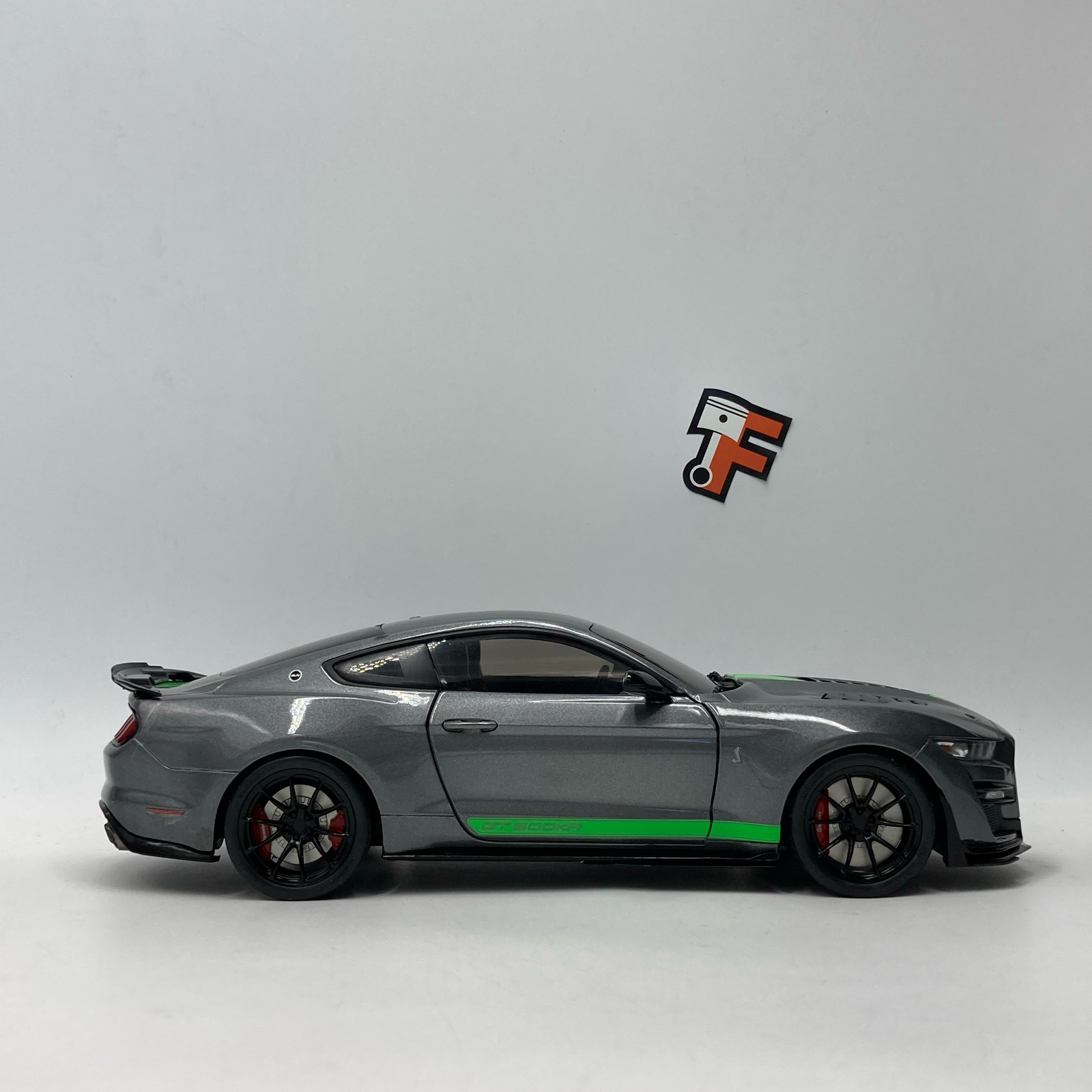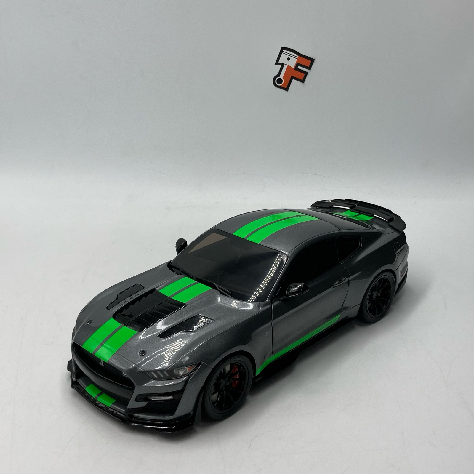 Sous le capot de la version réelle se cache un V8 suralimenté de 5,2 litres, développant plus de 760 chevaux. Cette miniature rend hommage à cette puissance avec une précision remarquable. Les portières ouvrantes permettent d’admirer un habitacle détaillé, fidèle aux standards de Shelby. La finition de la peinture grise, contrastée par les célèbres bandes sportives vertes, en fait une pièce maîtresse pour tout collectionneur de véhicules américains.