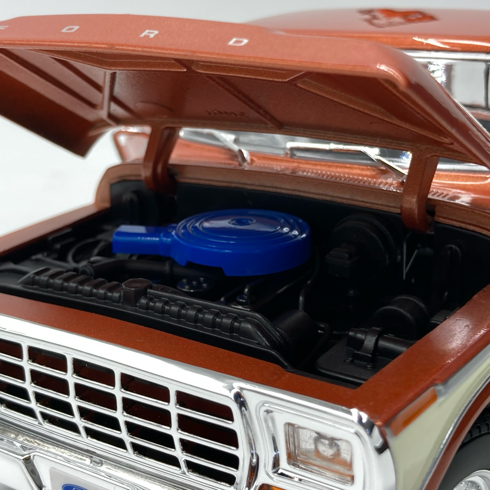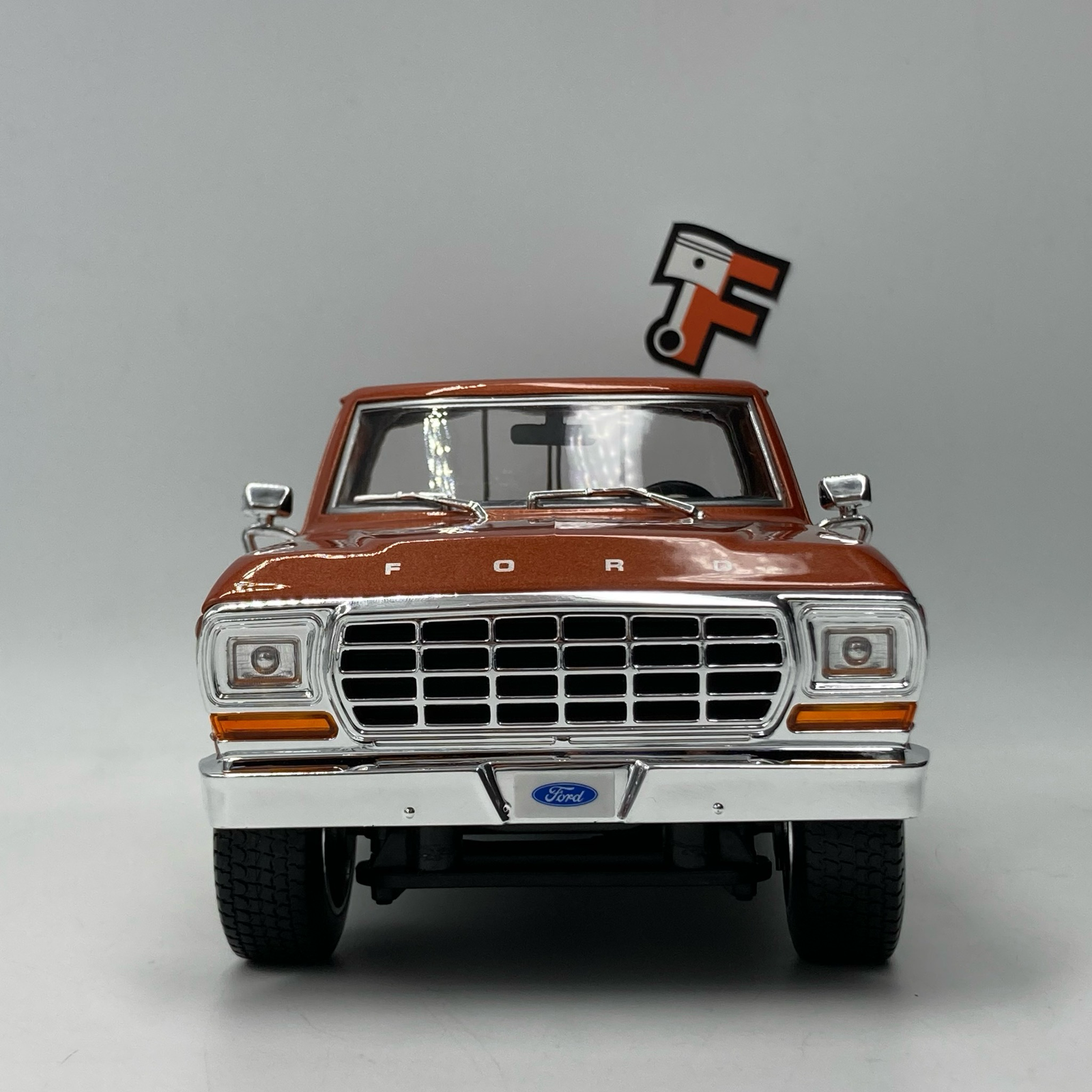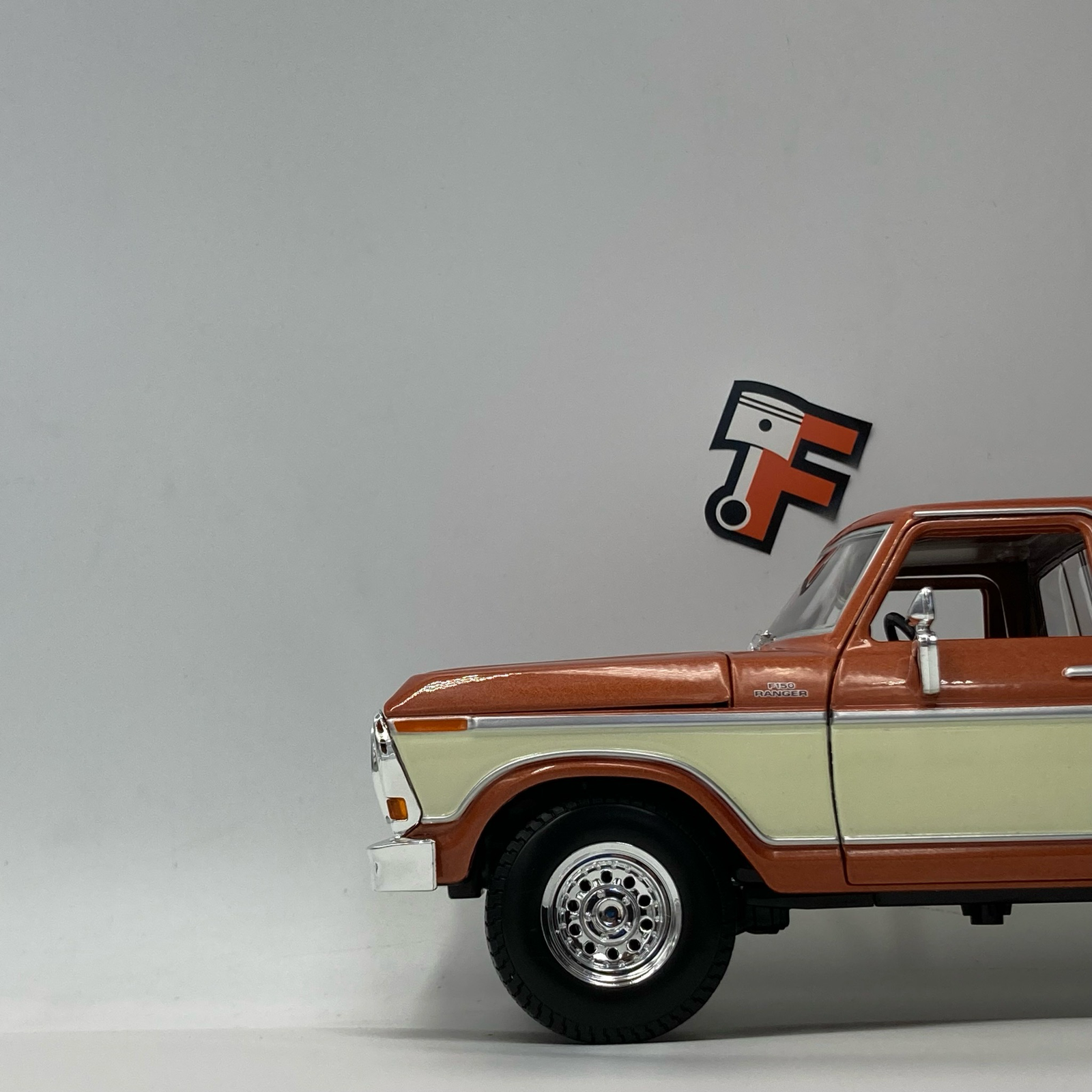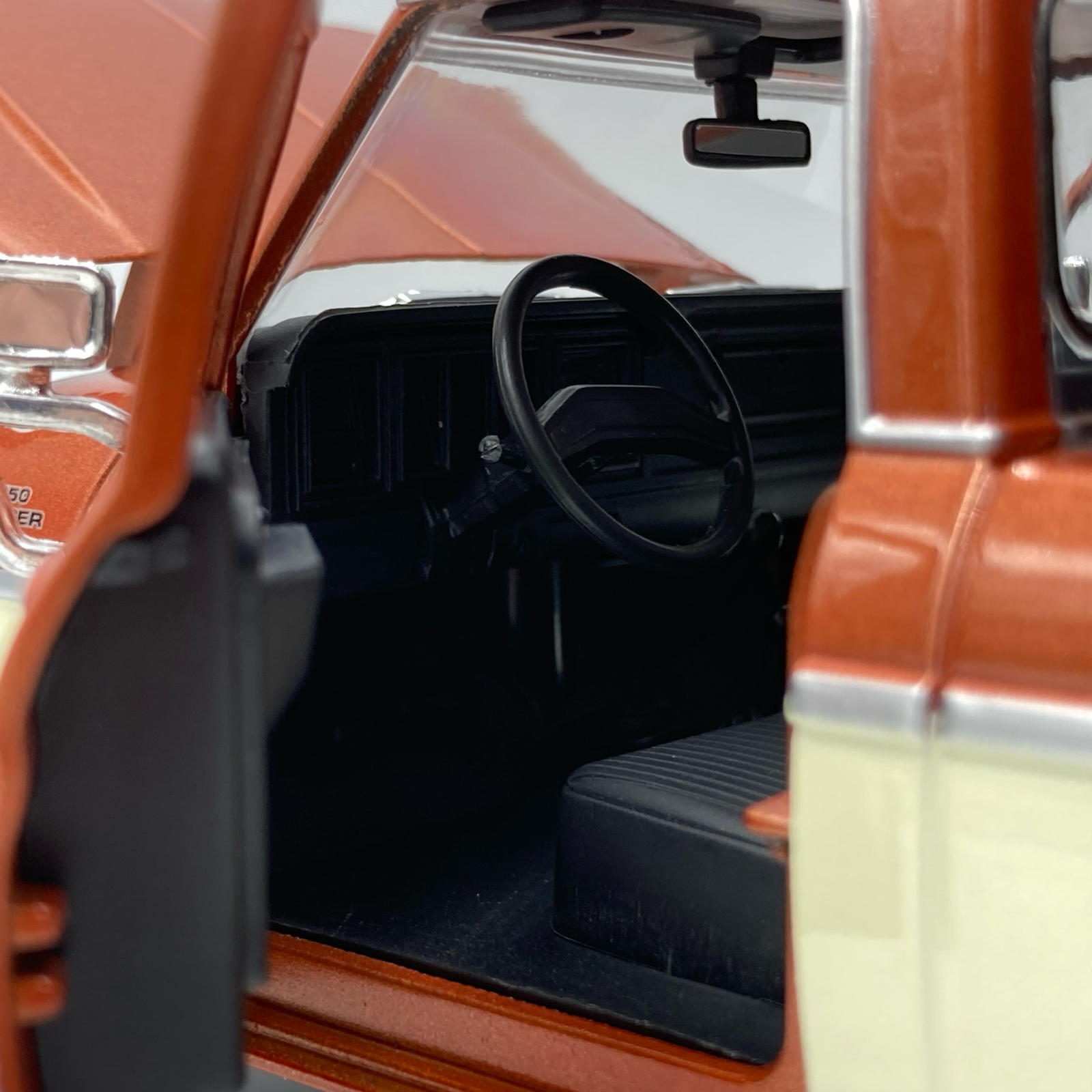 Le modèle de 1979 est particulièrement apprécié pour son design typique de l’époque : calandre imposante, lignes carrées, large capot et allure robuste qui symbolisent parfaitement l’esprit des pick-up américains classiques. La combinaison de couleurs Copper / Cream renforce encore son caractère vintage et lui donne une présence remarquable.