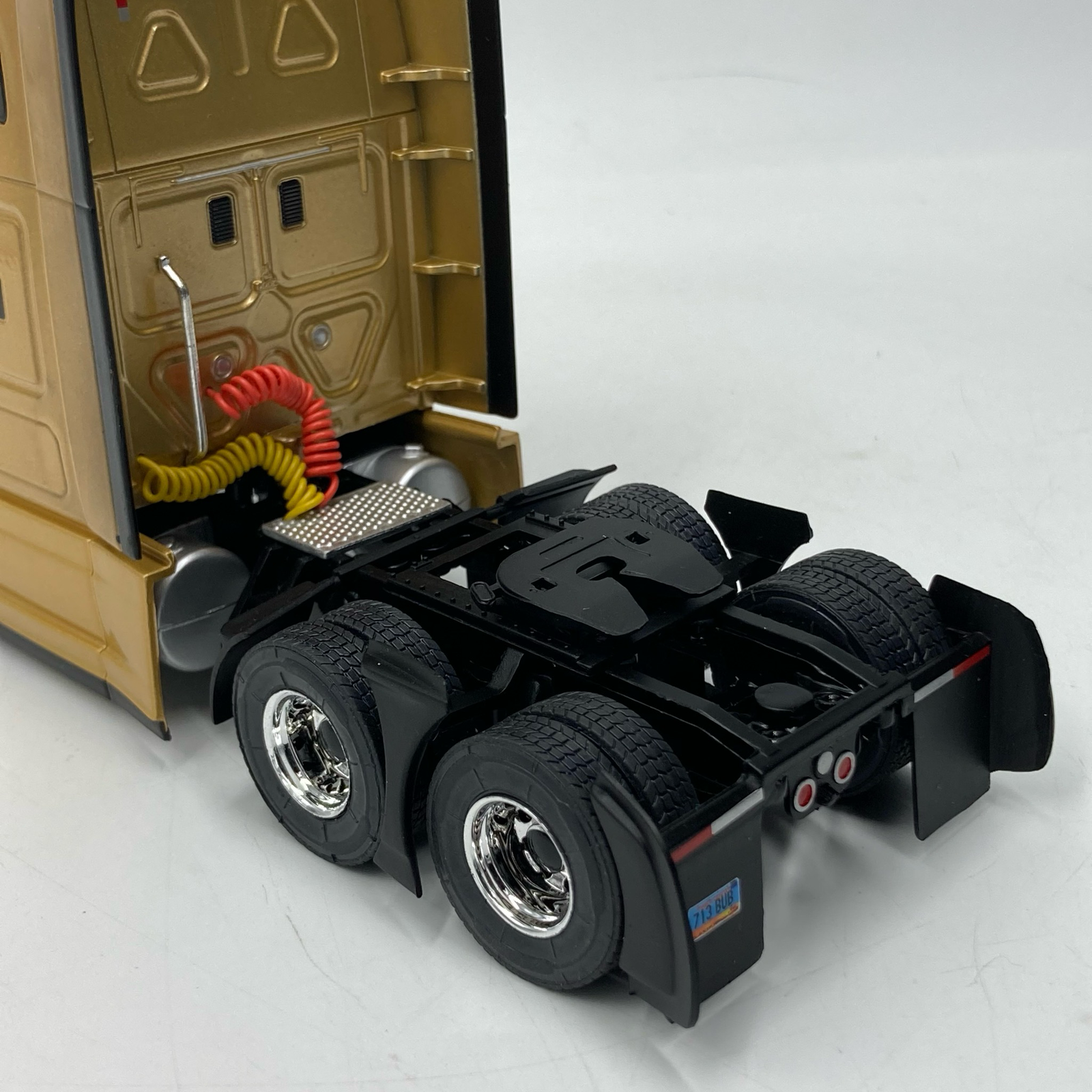 La finition dorée métallisée souligne chaque courbe sculptée pour fendre l’air, des carénages latéraux optimisés à la calandre imposante chromée. À l’échelle 1/18, les dimensions de ce tracteur routier sont tout simplement impressionnantes, offrant une présence visuelle inégalée dans une collection de véhicules industriels. IXO a apporté une attention méticuleuse aux détails : les optiques de phares modernes, les rétroviseurs profilés et les jantes étincelantes qui contrastent magnifiquement avec la carrosserie dorée.