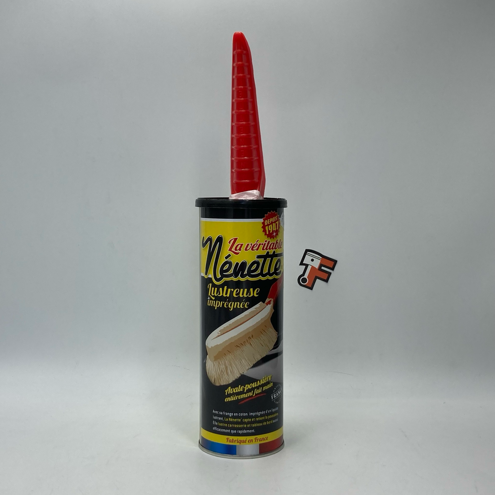La seule et véritable. La Nénette est une frange en coton imprégnée d’un liquide lustrant (sans silicone), le Nénétol fait main et fabriquée en France. Elle capte et retient la poussière, lustre la carrosserie et le tableau de bord de la voiture, efficacement et rapidement. Il ne faut que quelques minutes, sans se salir les mains, pour rendre à la carrosserie tout son éclat.