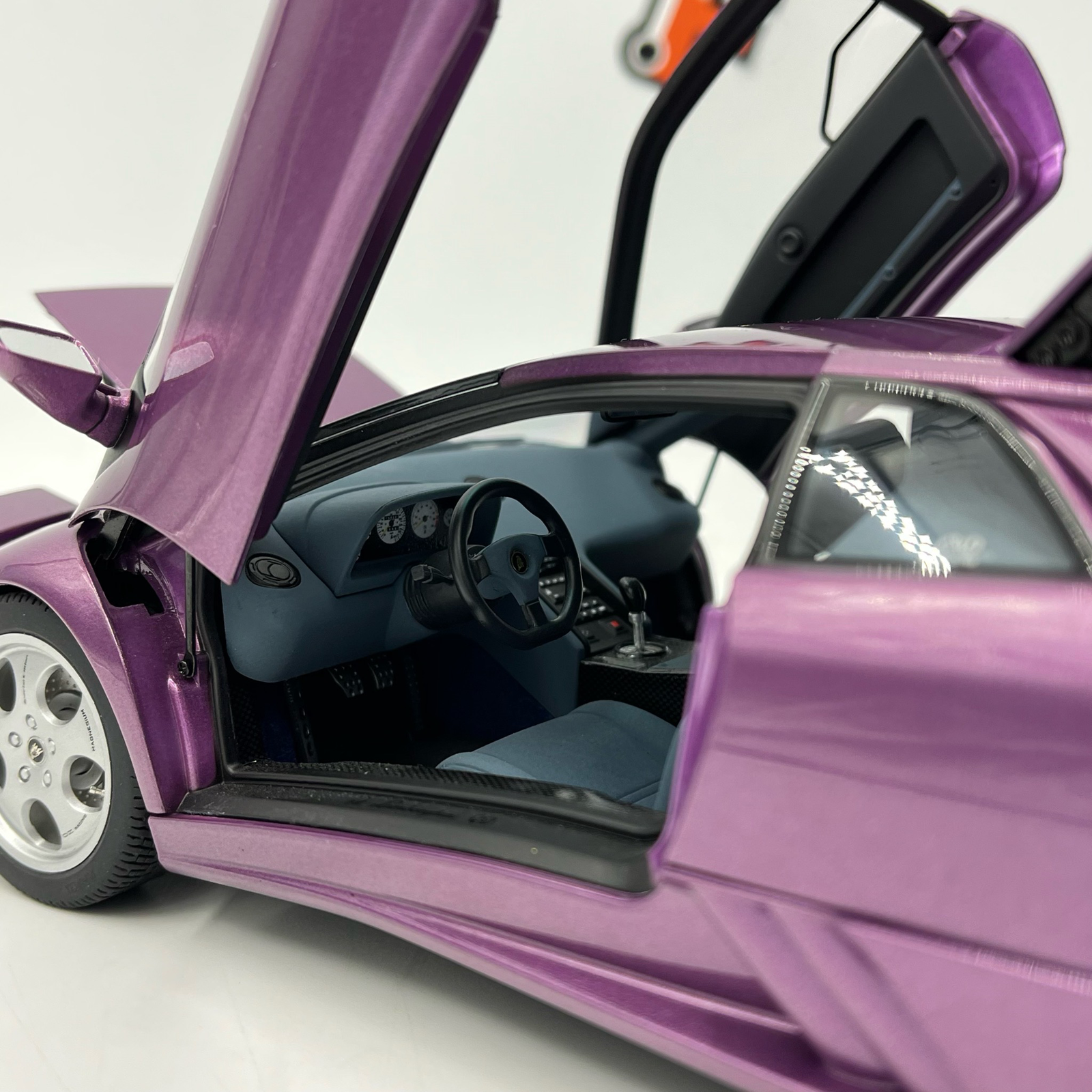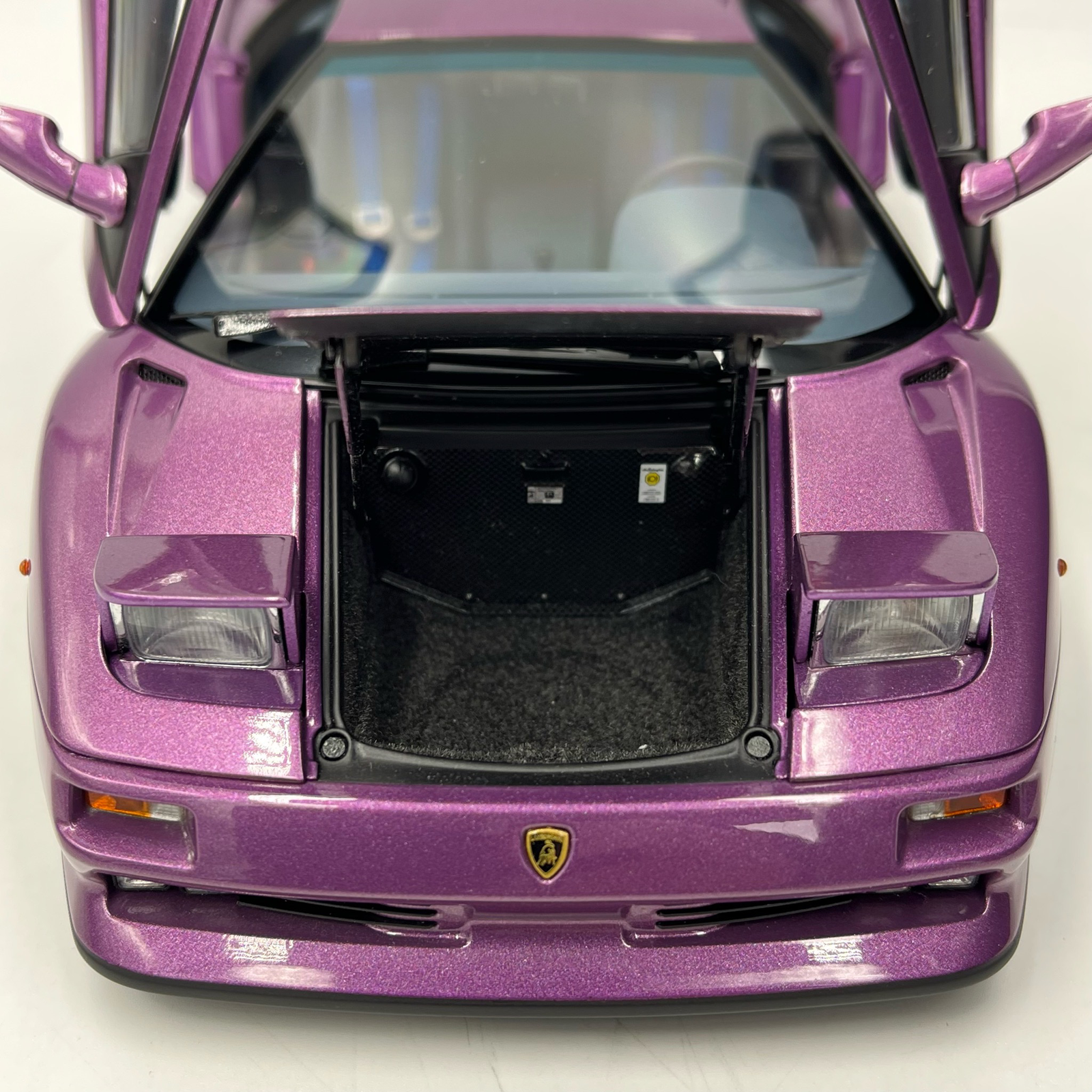 Chaque aspect de cette Diablo SE30 JOTA a été reproduit avec un souci du détail obsessionnel. L’intérieur épuré, typique des versions allégées JOTA, les vitres latérales fixes avec leur petite ouverture coulissante, et le compartiment moteur détaillé font de cette miniature un objet d’art. La peinture Viola SE30 bénéficie d’un éclat profond qui réagit magnifiquement à la lumière, capturant l’essence même de l’exclusivité Lamborghini. Pour tout collectionneur de « Raging Bull », posséder la SE30 JOTA est l’aboutissement d’une quête.