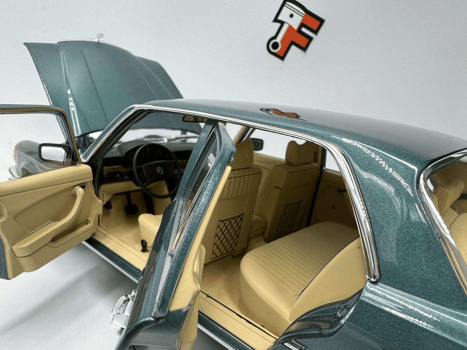 Reconnaissable à sa silhouette élégante et imposante, la 450 SEL 6.9 offrait une expérience de conduite exceptionnelle grâce à sa suspension hydropneumatique et son intérieur raffiné. Sa teinte Blue Petrol (bleu pétrole) souligne parfaitement son caractère à la fois discret et prestigieux.