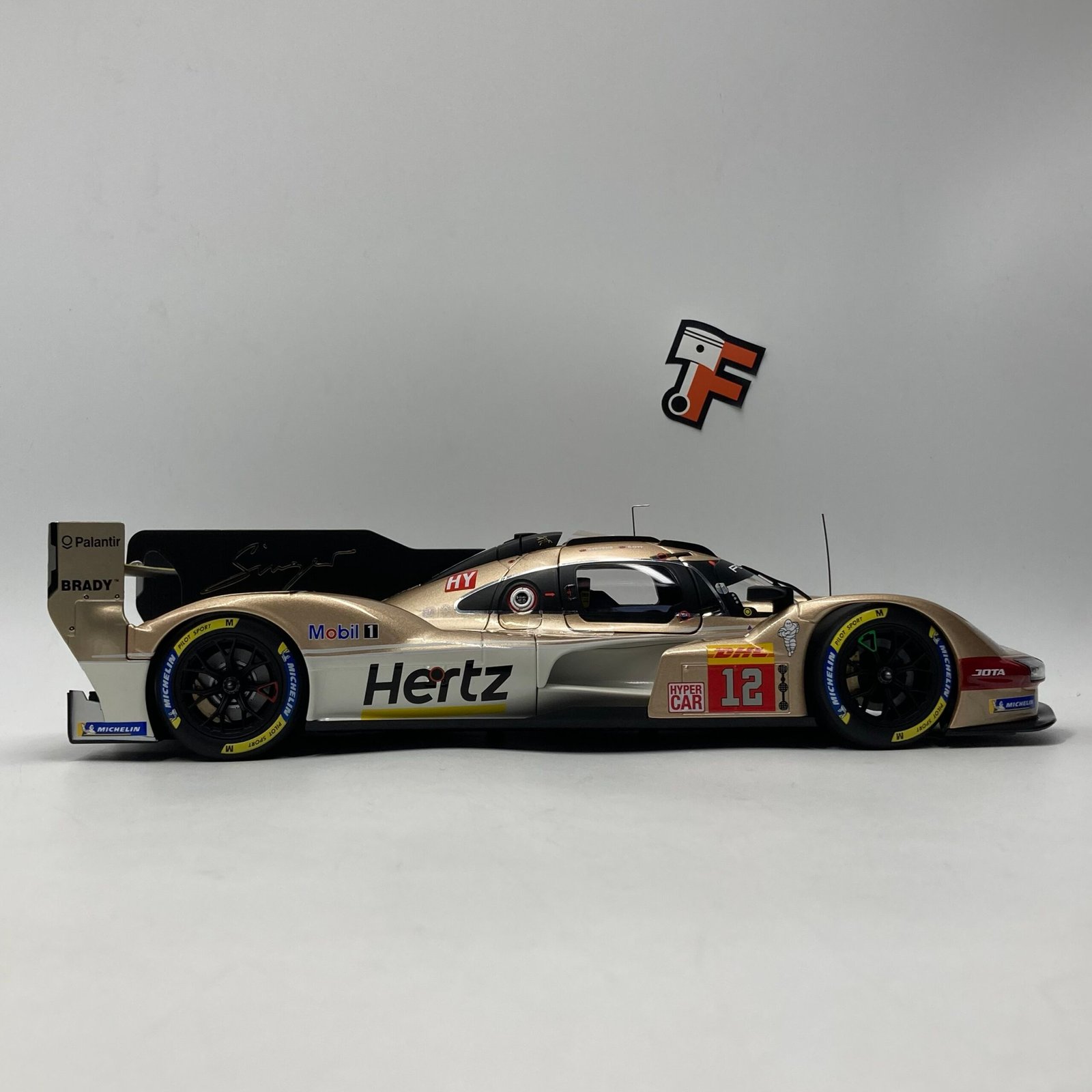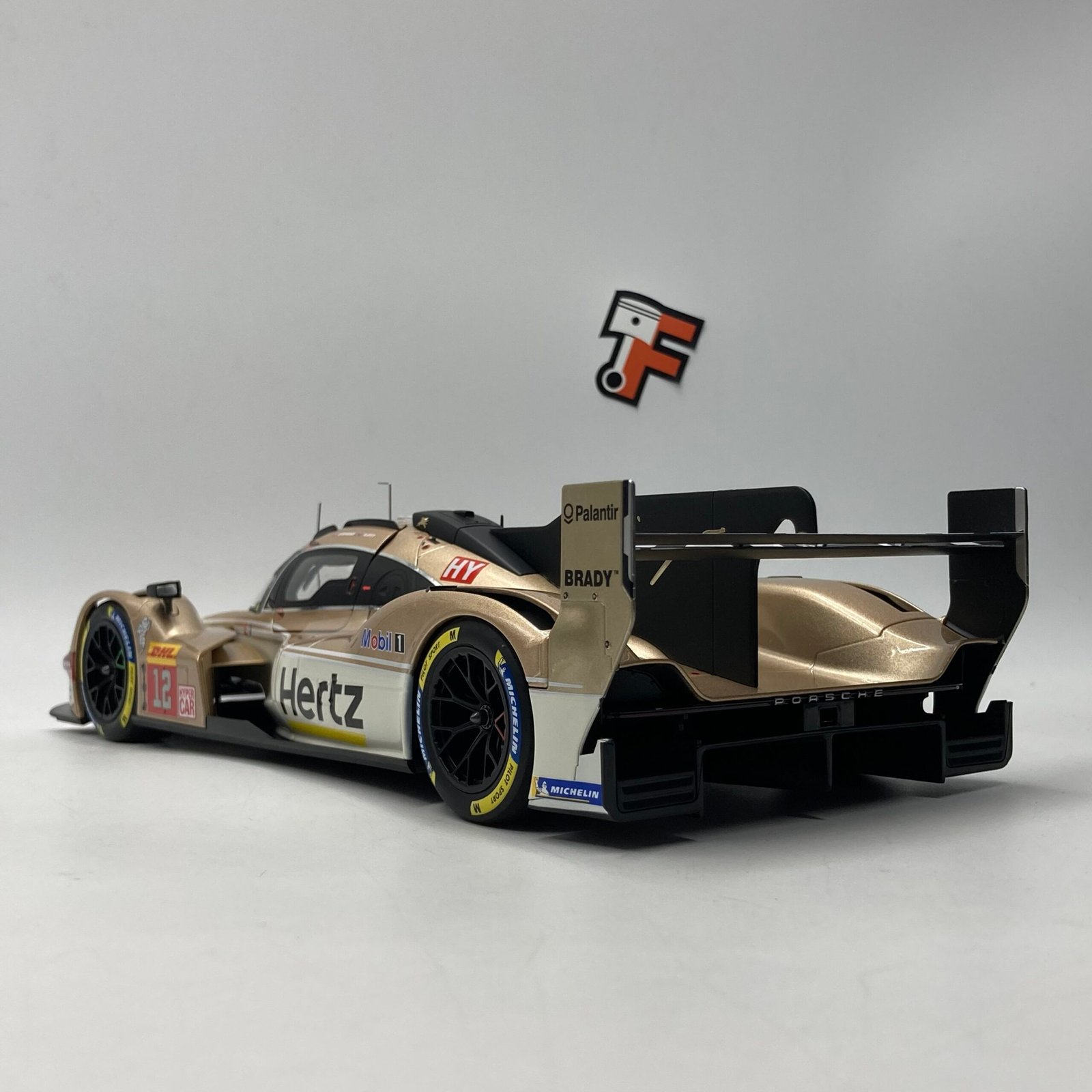 Cette réplique signée Norev est un chef-d’œuvre de précision. Chaque appendice aérodynamique, de l’aileron arrière massif aux prises d’air complexes, est reproduit avec une fidélité absolue. La peinture dorée satinée capte la lumière avec élégance, tandis que les marquages des sponsors et les détails du cockpit témoignent d’un niveau de finition exceptionnel. C’est une pièce maîtresse pour tout collectionneur de véhicules de sport moderne et de prototypes du Mans.