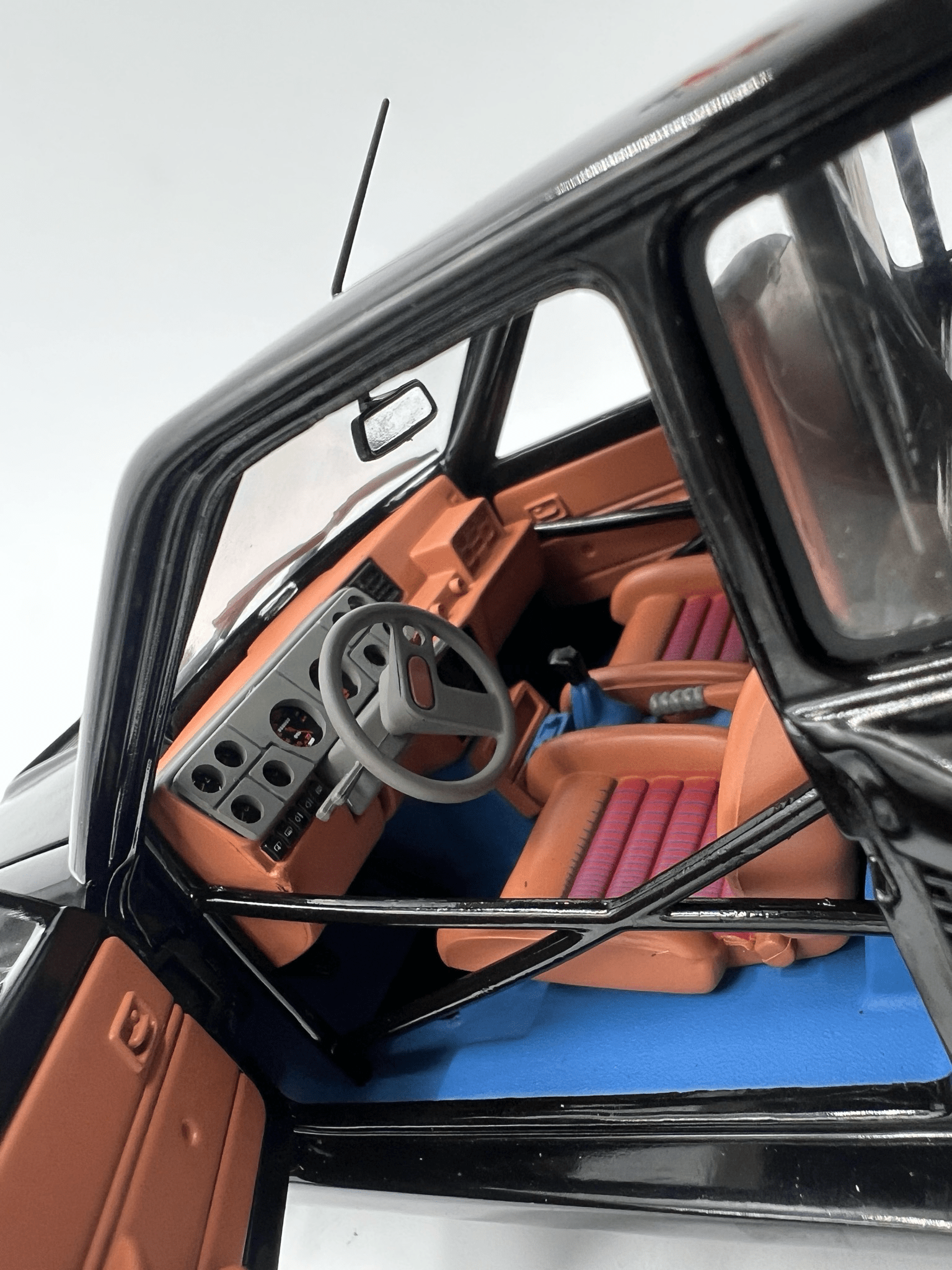 Intérieur reproduit dans le style course des années 80
