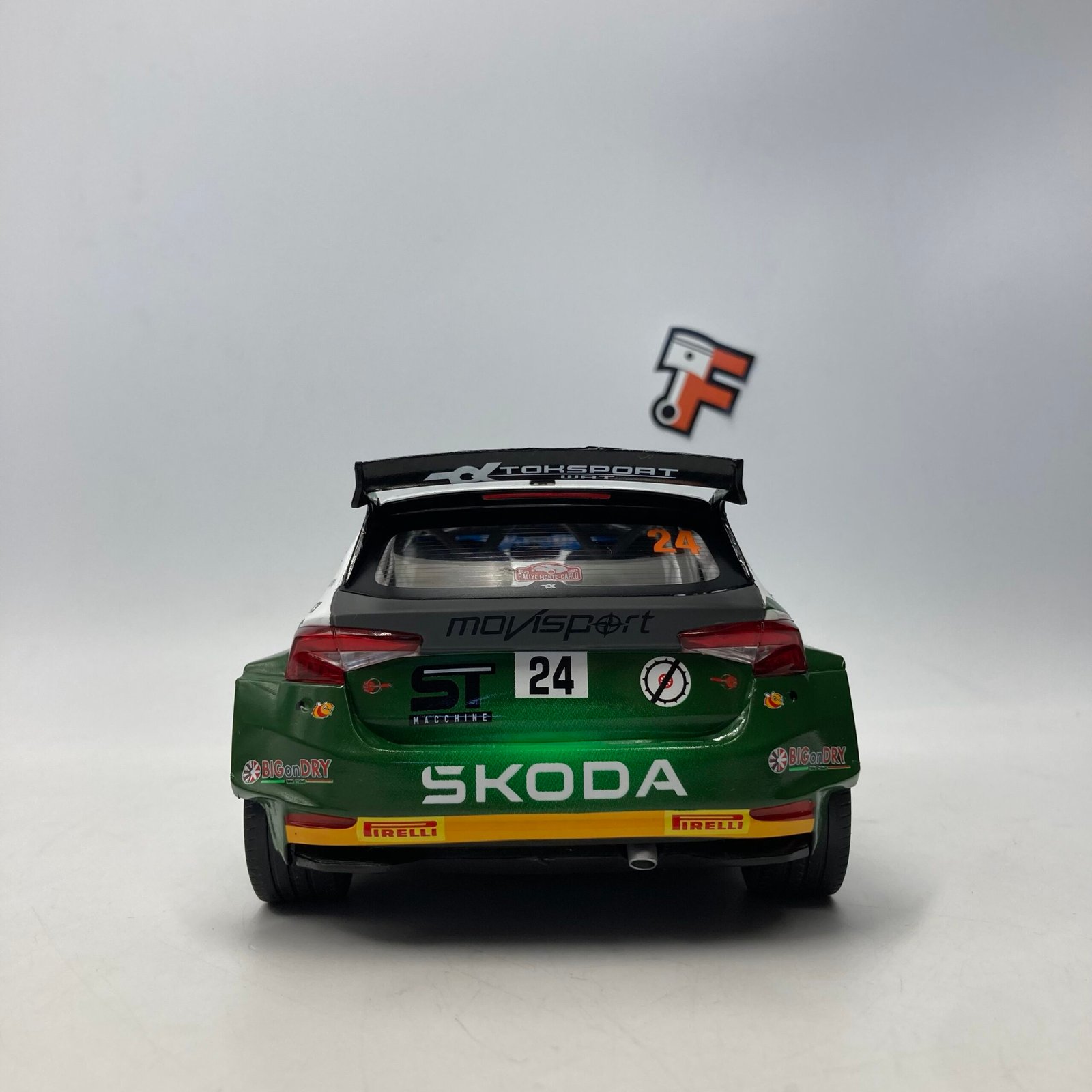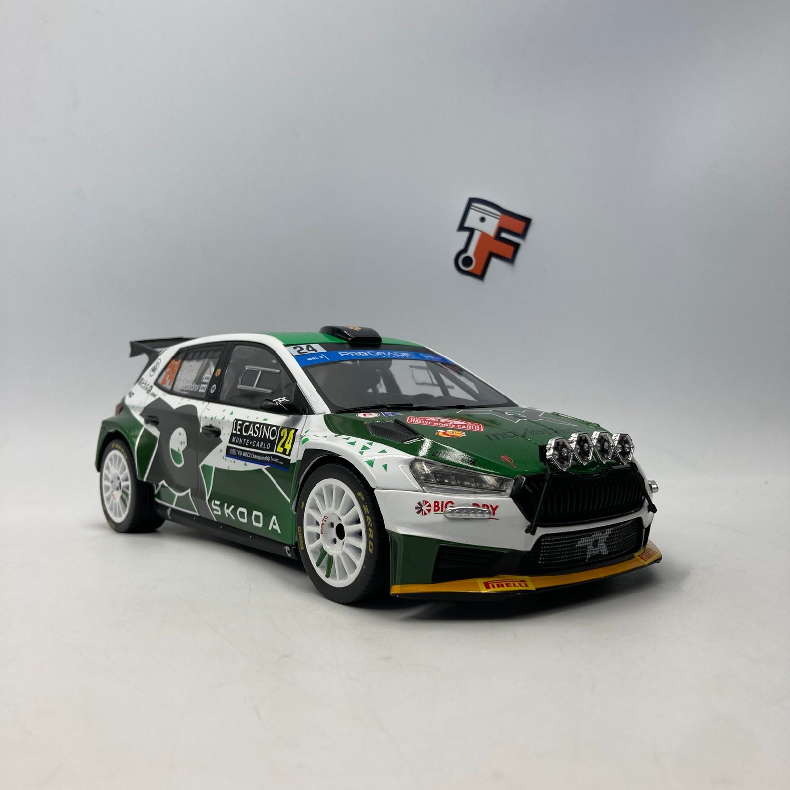 La Skoda Fabia Rally2, développée par Škoda Motorsport, est une référence dans la catégorie Rally2 grâce à son équilibre parfait entre performance, fiabilité et maniabilité. La livrée #24 utilisée lors du Monte-Carlo 2023 reflète l’identité visuelle dynamique de l’équipe, avec des détails fidèles à la voiture engagée en compétition.